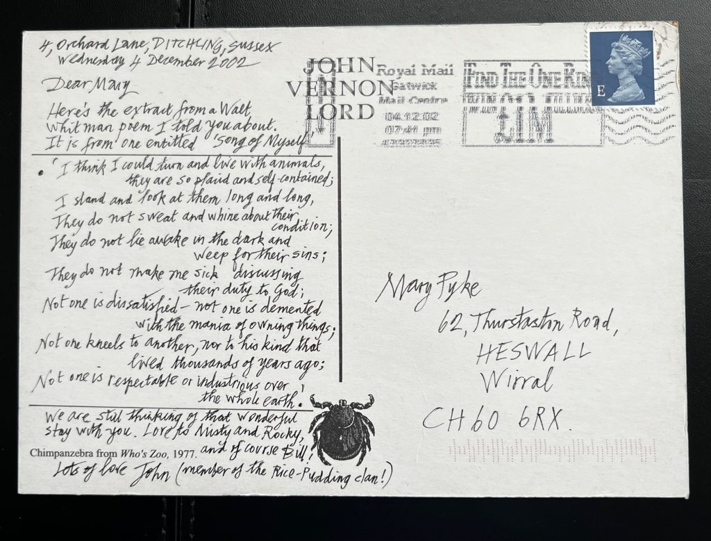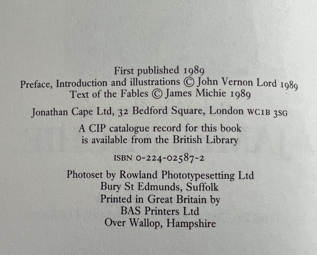 The First UK printing published by Jonathan Cape, London in 1989 of this illustrated edition. The BOOK is in near Fine condition with some very light pushing to the spine tips and some light toning to the text-block. The WRAPPER is compete and is in near Fine condition. The wrapper is protected in a removable Brodart archival cover. Striking illustrations, which comprise endpaper decorations, ten full-page or double-spread drawings, and scores and scores of vignettes, decorations and illustrations in the text by John Vernon Lord. The book has been inscribed by John Vernon Lord to the front illustrated end-paper : 'To Bill and Mary, After a marvellous visit to Heswall - rambling among genealogy & the Wirral, ferrying across the Mersey and treading the pavements of Jordan Street, visiting sundry educational establishments in Wales and England, eating and drinking well, plus many conversations amongst the sniffing and trotting to and fro of Rocky and Misty. Lots of love from John and Denie, 29 November 2002'. Loosely inserted is a large postcard ('The Chimpanzebra from Who's Who 1977') which has been H/W from John Vernon Lord to the same recipient Mary (Pyke). In which Lord has transcribed an extract from a Walt Whitman's poem 'Song of Myself'. He continues to add : 'We are still thinking of that wonderful stay with you. Love to Misty and Rocky, and of course Bill, lots of love John (Member of the Rice-pudding clan!)'. In a separate envelope which has been addressed in the illustrator's handwriting to to same recipients 'Bill and Mary', are 12 various large postcards (all clean) with John Vernon Lord Illustrations. 'John Vernon Lord is an illustrator, author and teacher. He is widely recognised for his illustrations of various texts such as 'Aesop's Fables', 'The Nonsense Verse of Edward Lear' and the 'Folio Society's Myths and Legends of the British Isles'. He has also illustrated classics of English literature, including the works of Lewis Carroll and James Joyce. Lord has written and illustrated several children's books, which have been published and translated into several languages. His book 'The Giant Jam Sandwich' has been in print since 1972' (Wiki). In 1990 his illustrations for this title 'Aesop’s Fables' won the overall prize in the ‘V&A / W.H. Smith Illustration' Awards. In 2018 his illustrations for 'Ulysses' won the ‘V&A Illustration Award for Book Illustration’ and the winner of the ‘2018 Moira Gemmill Illustrator of the Year Prize’. He was head of various departments, including the Head of the School of Design, at Brighton Art School, Polytechnic and University. He was Professor of Illustration at the University of Brighton from 1986-99, where he is now Professor Emeritus. An Honorary D.Litt. was conferred upon him by the University of Brighton in 2000. He was the chair of the Graphic Design Board of the Council for National Academic Awards from 1981-84. A very uncommon title more-so with such attributes.