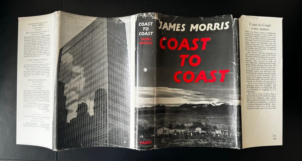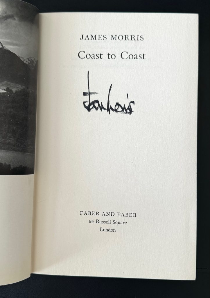 8vo., bright red cloth, lettered with decorative star borders in yellow to backstrip; original unclipped pictorial wrapper (21s net) with two black and white photographs and lettered in white and red; frontis photograph and a further five within text, as well as a double-page map showing journeys relevant to the narrative (p.264-265); The BOOK a near Fine copy, ever-so-slight pushing and rubbing to the spine ends and corners; endpapers mildly offset, otherwise a clean, bright example; the Very Good+ WRAPPER with just some creasing to folds, and some nicks/chips and creases, mostly affecting the upper edge and especially so to the head of spine; with a couple of closed tears (maximum 4cm) extending into front panel, and a 1cm chip to the front flap fold; internally reinforced with two pieces of tape. No fading of red lettering to the spine. The wrapper is protected in a removable Brodart archival cover. First edition, first UK printing, boldly signed by the author in black felt pen to the title page. An eventticket to the 2013 Literary Festival is also loosely inserted, at which Morris gave a talk “Contact! A Book of Glimpses”, and where this copy was signed. As The Times Special Correspondent, Jan Morris (identifying as ‘James’ when this book was published), was the only journalist to accompany the 1953 British Mount Everest expedition, climbing with the team 22,000 feet over a period of 16 days. Using a prearranged code to send news of the successful ascent, (announced in The Times on the day of Queen Elizabeth II's coronation), she thereafter undertook a tour of the USA, travelling across all 48 states by car, train, ship and aeroplane over a distance of some 70,000 miles. This book is the culmination of those experiences, and Morris’s first work of literature, capturing an America at a critical period of post-war development, at the very beginning of the civil rights movement, and at a time in which television was still in its infancy. “I did not know it then, and nor did America, but chance had brought me across the Atlantic at the very apex of American happiness”, Morris wrote in a later introduction. It was to be the birth of one of the greatest travel writers of our time, with a further 18 published travel works to follow over a period of some 50 years, including the hugely successful Venice, which won the 1961 Heinemann Award and which is widely hailed as being one of the best travel books ever written. Coast to Coast was the winner of the 1957 Cafe Royal Prize, and was published in the US as As I Saw the USA; 1956. “There is still a splendid variety to the life of the Americans; much sprightly individualism and homely kindness; much brashness, violence and hocus-pocus; and much of that bold personal initiative”. Scarce with such attributes.