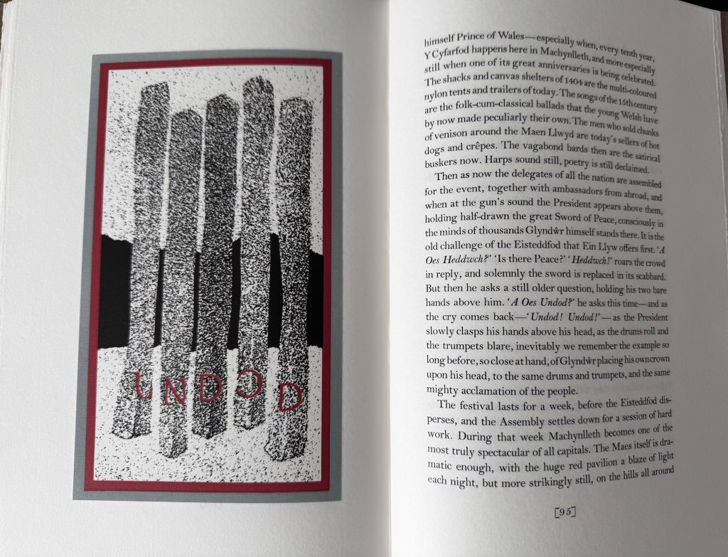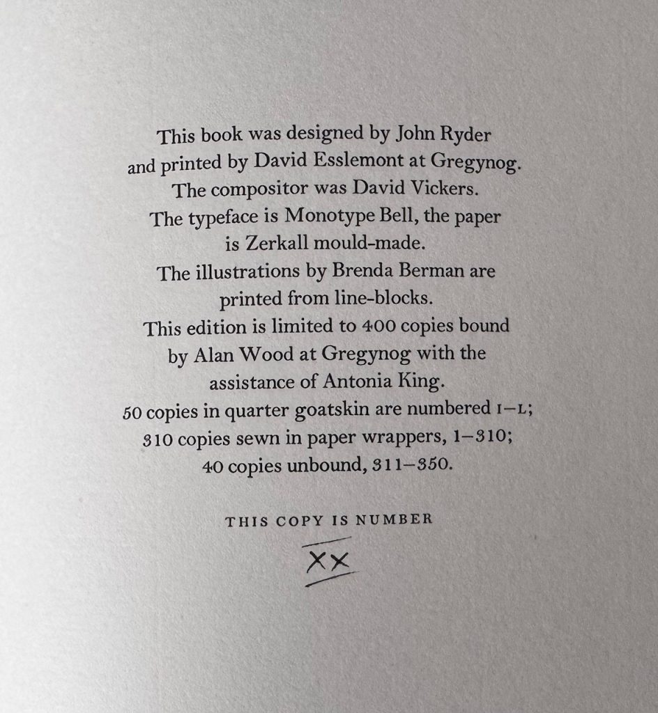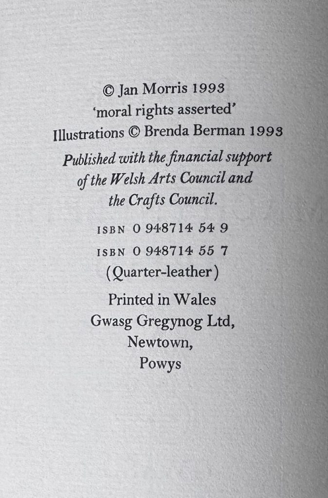 The First UK printing published by Gwasg Gregynog, Newtown in 1993. Foolscap 8vo. The special edition being number 'XX' of 'L' bounding quarter green goatskin, paper boards, gold rule, titled in gilt to the spine and housed within the original cloth-backed slipcase. The frontispiece and six other tipped-in illustrations are by Brenda Berman. The book was designed by John Ryder. The BOOK and SLIPCASE are all in Fine condition. The publisher's original prospectus and order form for the book are loosely inserted along with a publisher's compliments slip. This trilogy evokes three periods in the history of the Welsh town. The Welsh Rebellion against the English of the early 15th century, the present situation of 1991, and 'Y Dyfodol/The Future' imagines Machynlleth as the capital of the Welsh Republic celebrating an anniversary. A now elusive and very handsome production from the acclaimed travel writer.
