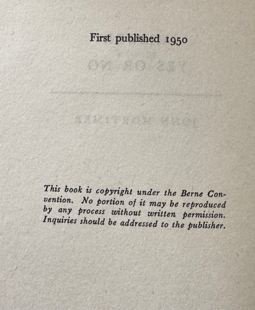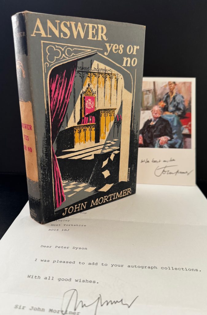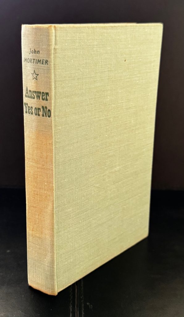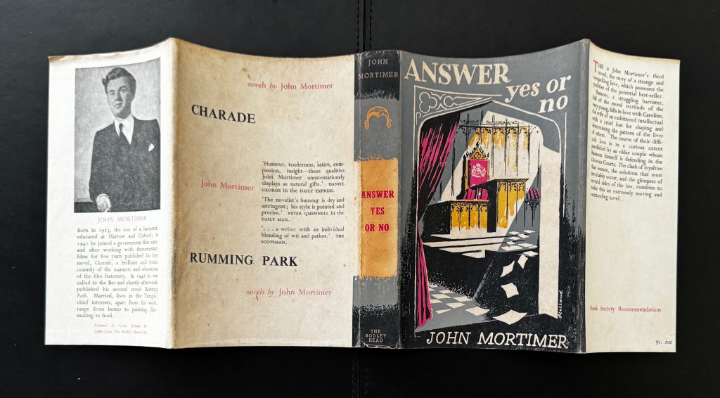 The First UK printing published by The Bodley Head, London : 1950. 8vo, pale blue-grey cloth lettered in dark green to spine; together in the unclipped wrapper (9s. net) featuring a design by Holland, and a black and white photograph of the author to the lower flap; The BOOK is a Very Good+ copy, patches of light ghosting and spotting to the backstrip; lightly spotted to the outer edges of text block; endpapers faintly offset; with a couple of scratches to the final page and paste-down leading to some closed tears; the Very Good+ WRAPPER is evenly toned, with some darkening to edges and lower fold; lightly rubbed at the edges, with a little subsequent nicking, creasing and chipping to the spine ends. The wrapper is protected in a removable Brodart archival cover. First issue of the author's third novel. This copy comes complete with a TLS on Mortimer's headed notepaper, signed to a Peter Dyson and stating 'I was pleased to add to your autograph collections', as well as a postcard showing the oil portrait of the author at the National Portrait gallery, also signed 'with best wishes, John Mortimer'. John Mortimer (1923-2009) was a barrister, dramatist, screenwriter and author who worked under Laurie Lee in WWI, writing scripts for propaganda documentaries. His first published novel was based on these experiences, working for the Crown Film Unit, though it is perhaps for his later writings, inspired by his own work as a barrister and his father's career in the same field (the Horace Rumpole short stories), that he is best known today. 'Answer yes or no' utilises a similar theme, and follows Ransom, a struggling barrister, and his experiences with love and divorce in the courtroom. Scarce with these attributes.