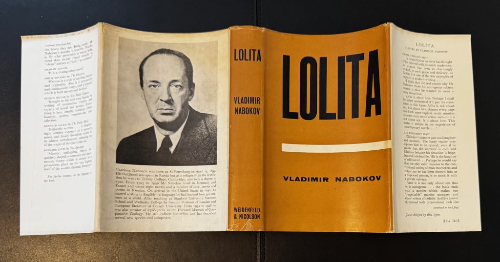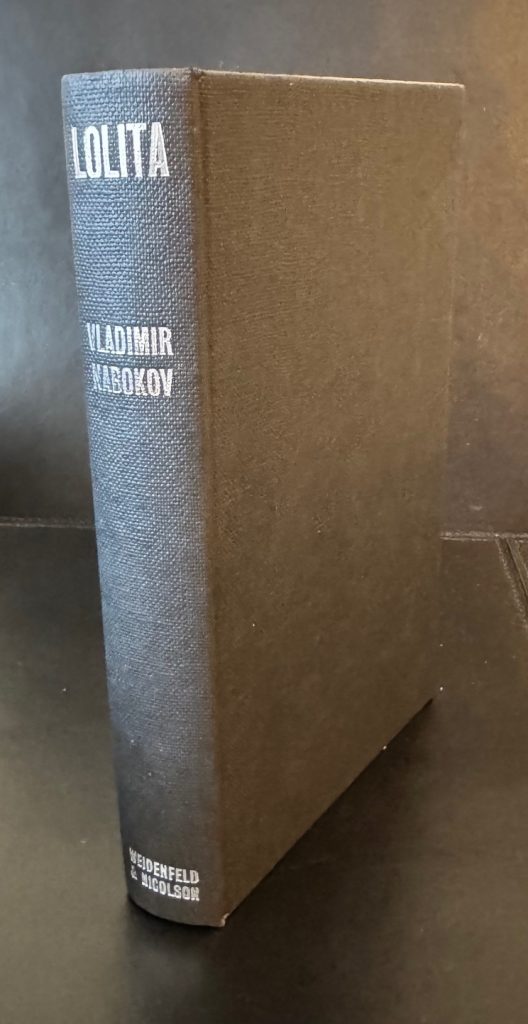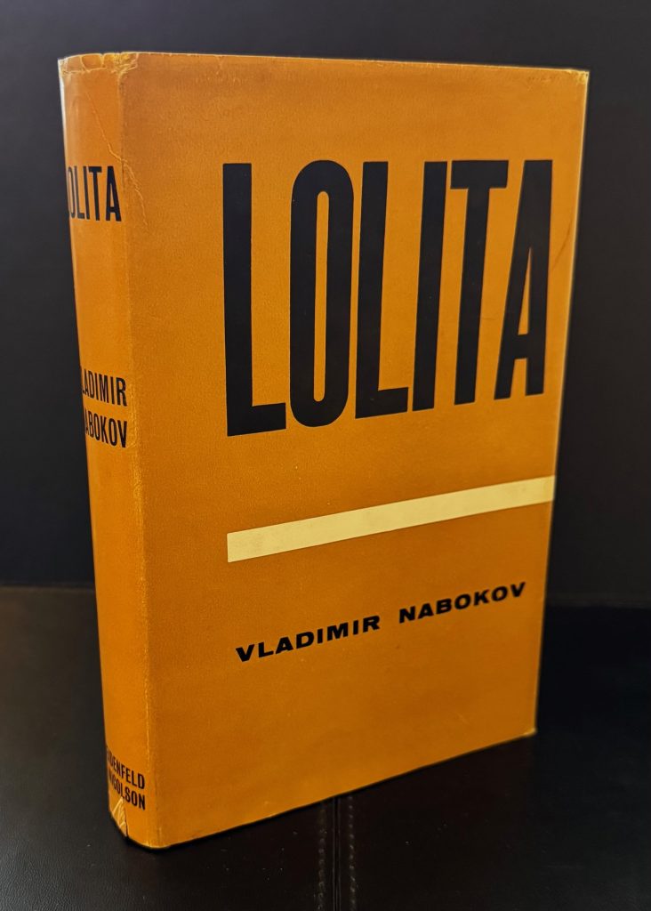 The First UK printing published by Weidenfeld and Nicolson, London in 1959. 8vo., black publisher's boards, spine lettered in silver, upper edge stained red; together in the unclipped dustwrapper designed by Eric Ayers; THE BOOK a near-Fine copy, save for light spotting to the edges of the text block; The WRAPPER also near-Fine, one of the nicest copies we have handled, with minor shelf-wear and markings, lightly creased at the edges, more-so to the spine tips; with a couple of short closed tears not exceeding 1cm in length. The wrapper is protected in a removable Brodart archival cover. First published in Paris under the Olympia Press imprint for fear of censorship, Lolita was written over a period five years, and finally completed in December 1953. Its subject matter, about a protagonist and his obsession with his landlady's 12 year old daughter, meant that it was rejected by almost all the US publishers Nabokov approached (including Viking, Simon & Schuster, Farrar, Straus, and Doubleday). The resulting 1955 Paris edition was reportedly "swarming with typographical errors", but nonetheless sold out of all 5000 copies of the first printing, and by the end of the year British customs had been instructed to seize and destroy all copies entering the UK. It was subsequently banned in France, and when it did finally appear in Britain, the resulting controversy ended the political career of one of the publishing partners, Nigel Nicolson, who was at the time a Conservative MP. In an interview with the BBC in 1962, Nabokov claimed that Lolita was "a special favorite of mine. It was my most difficult book—the book that treated of a theme which was so distant, so remote, from my own emotional life that it gave me a special pleasure to use my combinational talent to make it real." That same year, it was adapted into an award-winning film by Stanley Kubrick.