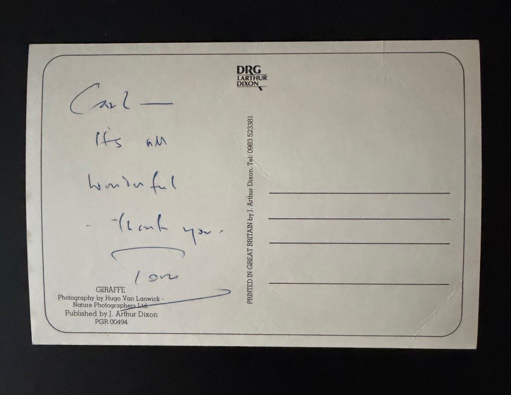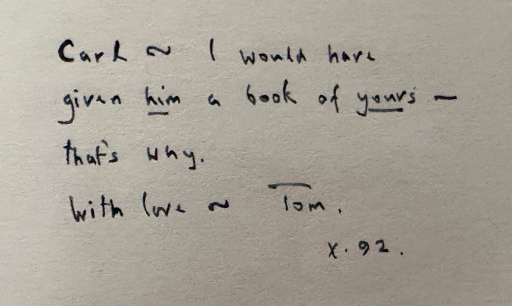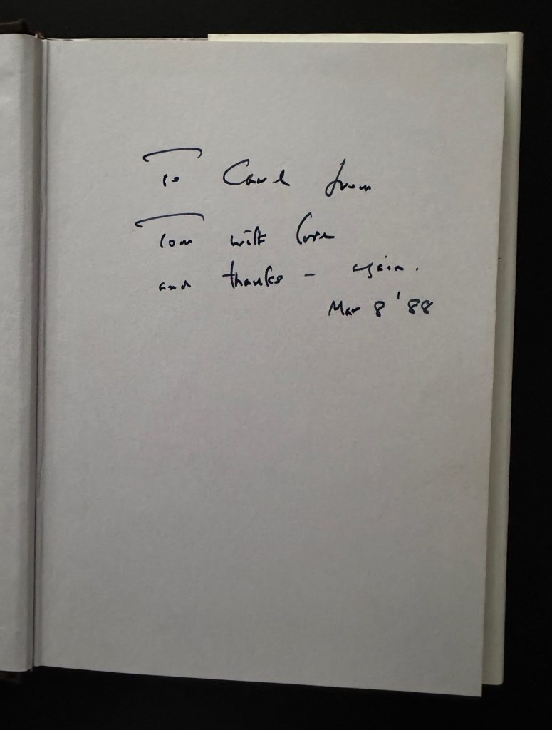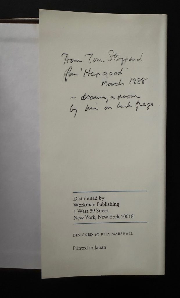 3 vols.; VOLUME ONE - Nash, Ogden ~ Zoo. 8vo., black cloth embossed in blind to upper cover; lettered in silver to spine; in the unclipped pictorial wrapper designed by Rita Marshall; die-cut half title; illustrated throughout with animal sketches by Etienne Delessert; The BOOK is a Fine copy in a very near Fine WRAPPER with just a couple of light marks and some shelf wear. The Second USA Printing published by Stewart, Tabori & Chang, New York in 1987. Ogden Nash's 'Zoo', includes three personal inscriptions by Stoppard, to Carl Toms. The first, to the front blank endpaper reads 'To Carl from / Tom with love / and thanks - again. / Mar 8 '88'. The second, to the rear flap of the wrapper, reads 'From Tom Stoppard / for 'Hapgood' / March 1988 / - drawing a poem / by him on back page.' The drawing he is referring to appears at the rear of the book, on p. [80]. Below a pencilled sketch of a giraffe by Stoppard is a handwritten poem 'The giraffe / has the last laugh / and the highest / though I am biassed [sic]', he writes. Stoppard has also added his contribution in pencil to the contents page. Additionally, there is a laid in postcard of two giraffes with necks intertwined, which Stoppard has inscribed to the verso in blue pen 'Carl - / It's all / wonderful / - thank you. / Tom.' VOLUME TWO : Whistler, Rex ~ Designs for the Theatre. The First UK printing published by B. T. Batsford Ltd., London in 1950. 8vo., green cloth-backed pictorial boards, spine lettered in red; clipped wrapper with borders and devices in red; numerous illustrations throughout in both black and white and full colour; The BOOK with slight shelf-lean and rubbing to outer edges of boards; Ex Library, with ink number to foot of spine, and stamps (including withdrawn stamp) to p. [ii]; THE WRAPPER good, though with ink and embossed stamps of Folkestone Public Library to upper panel; detached along spine and faded/rubbed at backstrip, with a little loss of lettering and a couple of short closed tears. The book may have been picked up by Stoppard while he was browsing second hand bookshops, and he thought of Toms. This copy is similarly inscribed by Stoppard to the front free endpaper: 'Carl ~', he writes, 'I would have / given him a book of yours - / that's why. / With love ~ Tom. / x.92.'. VOLUME THREE : Hurry, Leslie [Lillian Browse, (Ed.)] ~ Leslie Hurry. Settings & Costumes for Sadler’s Wells Ballets. The First UK printing published by Faber and Faber for the Shenval Press in 1946. 8vo., oatmeal-coloured cloth lettered in grey-blue to upper cover and spine; unclipped orange wrapper (printed price of 5s. net to front flap crossed through and repriced in pencil); illustrations in black and white throughout, on glossy paper (frontis in full colour); The BOOK is in Very Good+ condition, with a little darkening and spotting to lower edge of boards; The WRAPPER sunned along the backstrip with some light nicks and shelf wear, else very good+. This volume comes from the personal library of Carl Toms, with his penned name and date 'Carl Toms / Oct 1946' to the front free endpaper. All three volumes are protected in removable Brodart archival covers. A collection of three titles from the estate of Carl Toms, with Tom Stoppard association. Carl Toms OBE (1927 – 1999) was a British set and costume designer, widely acclaimed for his work in theatre, opera, ballet and film. It was the 1970s when Toms met and befriended Tom Stoppard, and together they worked on a series of plays in both New York and London. These included some of Stoppard's best-loved productions, including 'Arcadia', 'Travesties', 'Night and Day', 'The Real Thing', 'Jumpers' and 'Hapgood' et al. A wonderful collection of three titles with some very personal inscriptions between two highly important figures in the world of theatre. In particular, the second volume's equating of Tom's work with that of Rex Whistler shows the high regard which Stoppard must have had for his friend. Toms passed away in 1999 and much of his library has been filtered into the public space since, but these three volumes remain some of the more scarce on the market, and are indicative of a unique and special relationship shared between the two men.