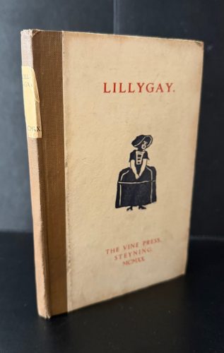 The sole UK printing published by The Vine Press, Steyning in 1920. Limited to 590 copies, this is number ‘526’ of 550 'ordinary copies on antique laid paper'. Half title, title printed in red and black with woodcut illustration, full-page woodcut illustrations by Eric and Percy West, the final poem 'Colophon' printed in red. The actual colophon printed in black, the title page unopened at the upper edge. Original brown cloth-backed pictorial paper boards by James Sharp North printed in red and black, printed spine label. The BOOK is in Very Good++ condition. Light pushing at the spine ends with some toning and age related markings to the board edges. Mild rubbing to the corners. Some toning and chipping to the spine paper label. The front free endpaper inscribed, 'This goes forth to the Binder - Than whom none is kinder - James Sharp North: a slight (??) From the Editor, Victor B. Neuburg, Steyning, Sussex, 3i:i:2i.' "The Vine Press at Steyning has produced interesting work, typical of this free and enjoyable period, and its first book, 'Lillygay', issued in 1920, expresses the character of what followed. It is an anthology of anonymous poems. The woodcuts by Percy West are cheerful and chapbook in style, like Tuer's books from the late nineteenth century or Lovat Fraser's more recently, or Jack Yeats in the Cuala Broadsheets ... The type is nothing to write home about but the book is a success ..." (Franklin, The Private Presses (1969)). Victor B. Neuburg was a poet, writer, theosophist and occultist, friend and sometime partner of Aleister Crowley. Having served in the First World War, he moved to Steyning in West Sussex where he founded The Vine Press. The present collection 'Lillygay' was its first publication. Although the title page describes the poems contained in it as 'anonymous', many were largely Neuburg's own work, or his free adaptations of traditional ballads. The composer Philip Heseltine, better known under his pseudonym Peter Warlock, set five of them to music. The book is protected in a removable Mylar archival cover. Scarce.