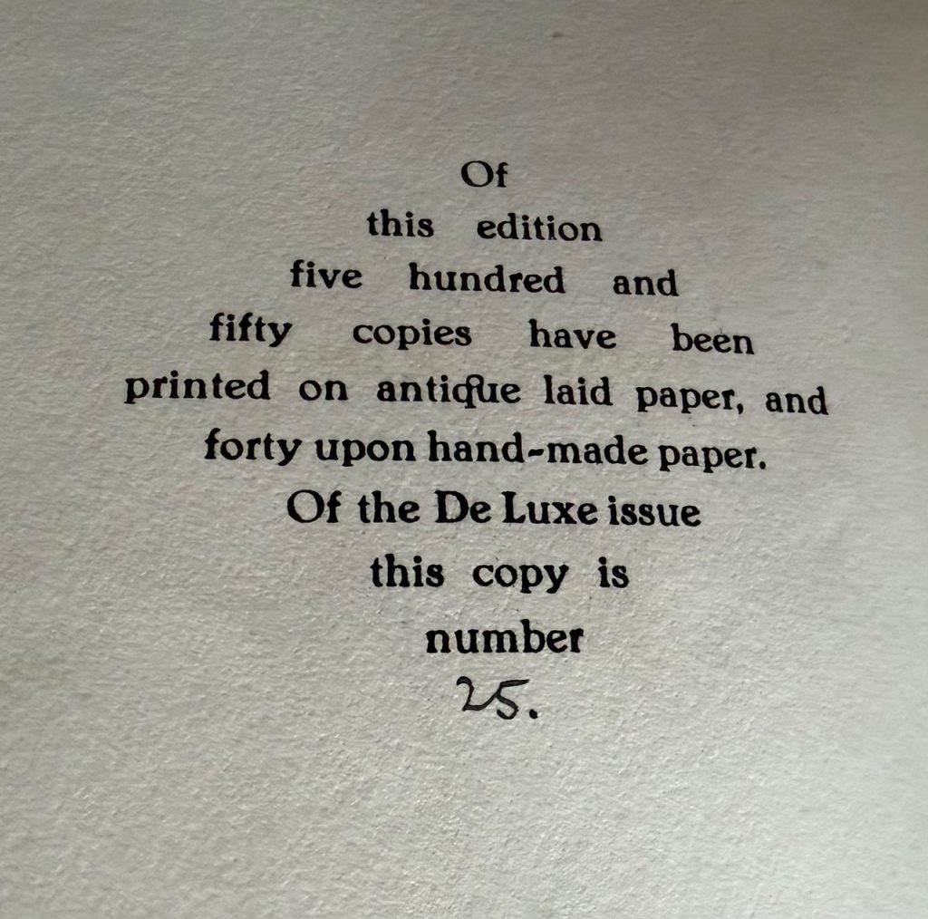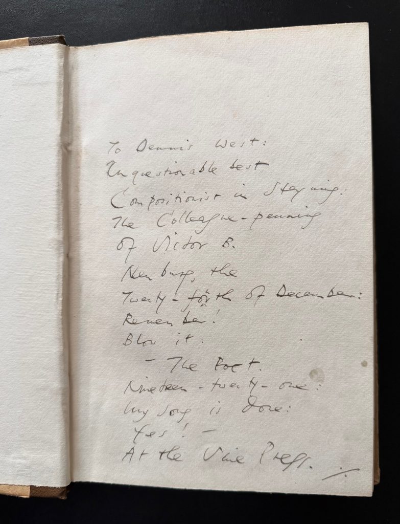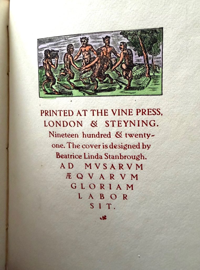 The First UK printing published by The Vine Press, Steyning in 1921. Number ’25’ of 40 ‘de-luxe’ copies printed on hand-made paper, from a total limitation of 590 copies. 2 hand-coloured woodcut illustrations and B/W initials by Dennis West. The BOOK is in Very Good++ condition. A little pushing and rubbing at the spine ends and corners. A little age related toning to the boards to the boards. The paper label to the spine is slightly chipped. The spare label is complete and tipped to the last end-paper as issued. Internally just the odd spotting and toning to the page edges in places. Original pictorial paper-covered boards designed by Barbara Linda Stanbrough. Erratum slip present page 39. The book has been inscribed by the author to the artist Dennis West : ‘To Dennis West, Unquestionable best compositionist in Steyning, the colleague-penning of Victor B. Neuberg, the twenty-fourth of December, Remember !, Blow it : , - the poet, nineteen-twenty-one:, my song is done:, yes!-, At the Vine Press’. Neuberg was an author, poet and occultist, and a friend and sometime partner of Aleister Crowley. As poetry editor of the ‘Sunday Referee’, Neuberg had been the first to publish Dylan Thomas’ work. The book is protected in a removable Mylar archival cover. Scarce.