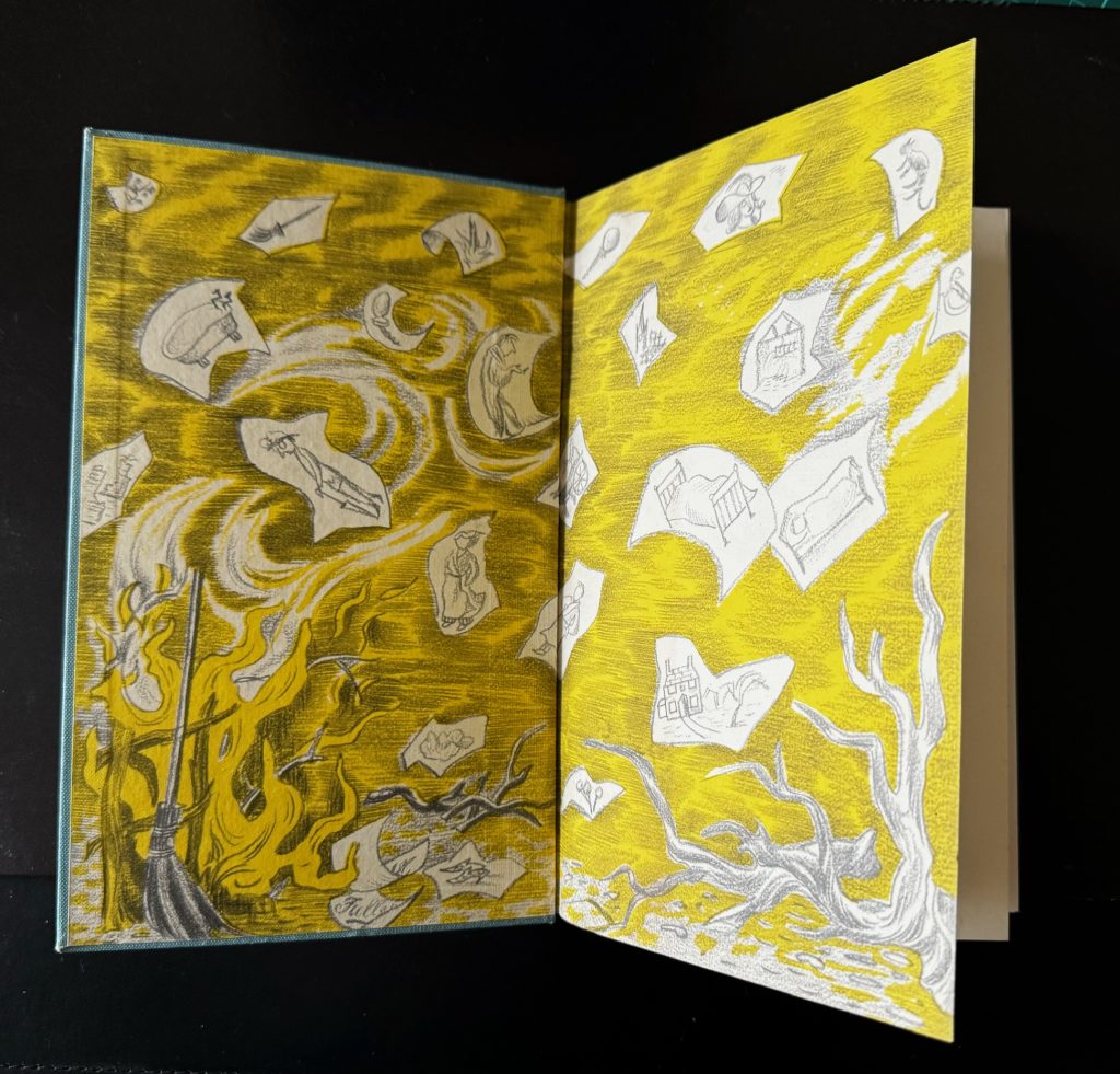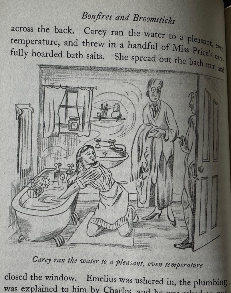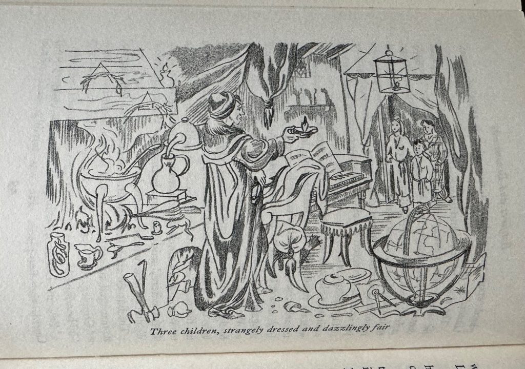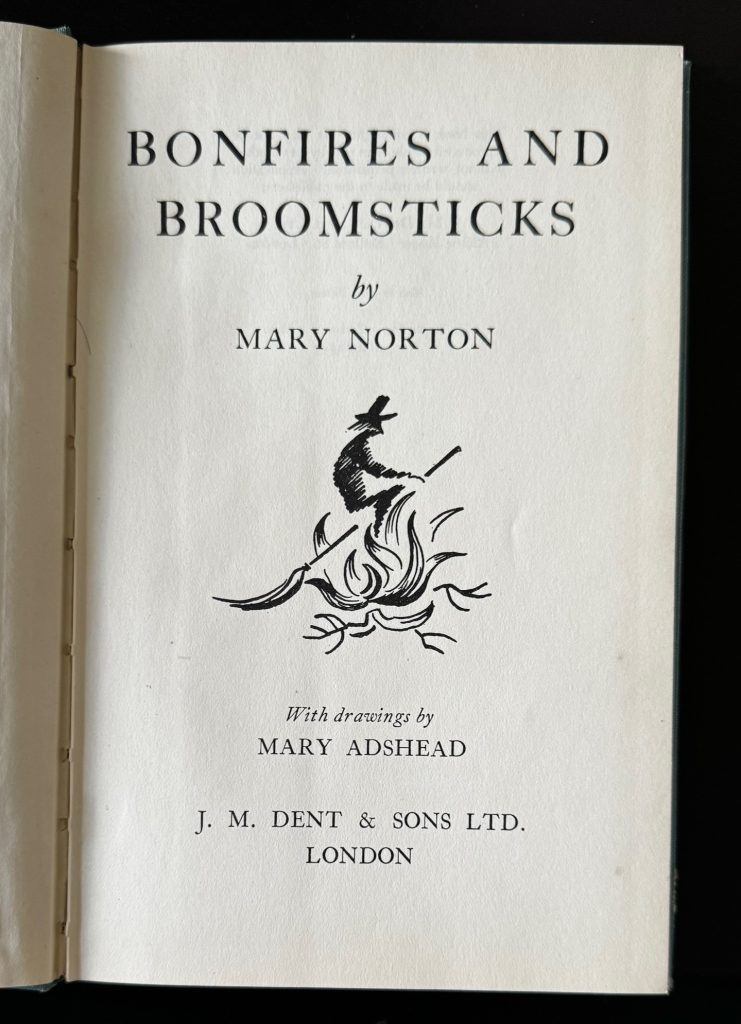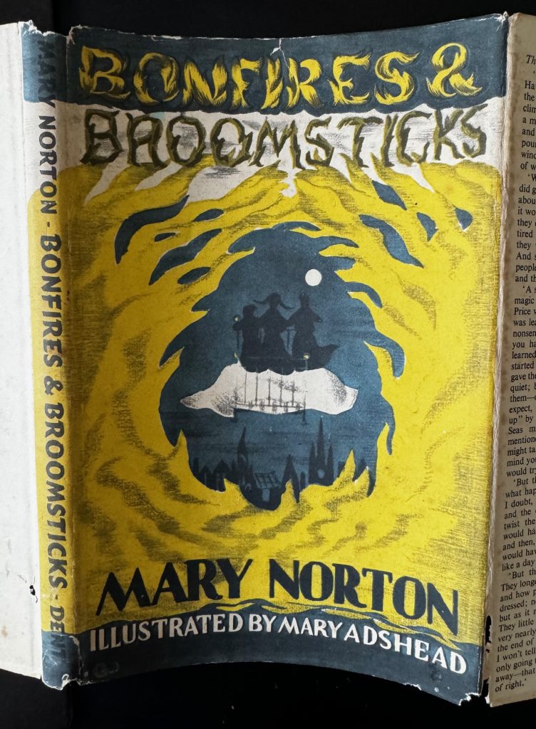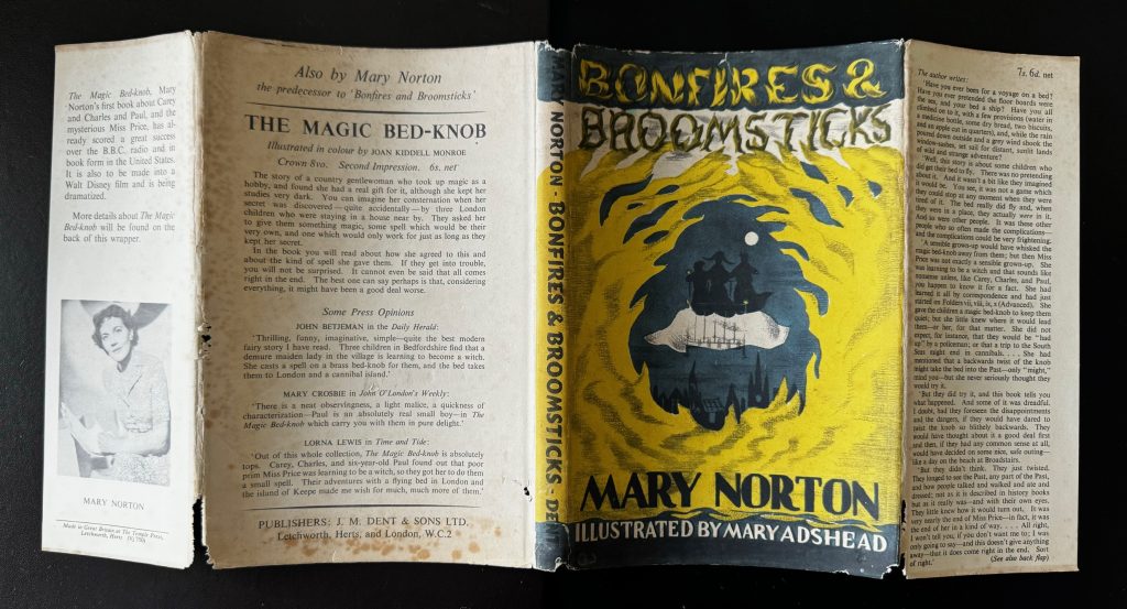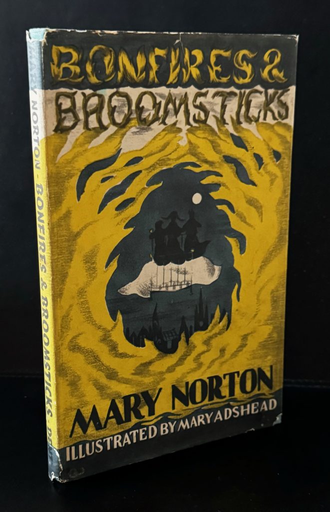 8vo., pale blue cloth, lettered in dark blue to upper board and backstrip, featuring the emblem of a witch aboard a broom in orange to the centre of upper board; striking decorative yellow endpapers; vignette to title page echoing the upper board; with 26 captioned black and white sketches throughout by Mary Adshead; together in the unclipped illustrated wrapper (7s. 6d. net); THE BOOK a lovely, bright, near Fine copy, the boards a touch splayed with some minor rubbing to the cloth at the edges; a couple of very light spots to the endpapers; the Very Good+ or better WRAPPER, which has done a fine job of preserving the boards beneath, lightly spotted at folds and lower panel; with two small patches of worming causing a little loss to the lower flap fold; spine ends a little chipped at ends; one small closed tear (1cm long) to front panel; Some spotting to the lower rear panel and olds. The wrapper is unrestored and is protected in a removable Brodart archival cover. First edition, following on from the author’s previous book, 'The Magic Bedknob'; or, 'How to Become a Witch in Ten Easy Lessons' (published in 1944). Together, the two works formed the original story for the now-famous children’s film 'Bedknobs and Broomsticks', which was adapted by Disney in 1971. 'The Magic Bedknob' followed the story of three children; Carey, Charles and Paul, who discover that their neighbour, Miss Price, is a witch. In exchange for their silence, the spinster casts a spell on their bed so that when the bedknob is turned, it will fly them wherever they wish to go. Three years later, Norton published this, the sequel, which picks up with the three children travelling back to stay with Miss Price, and this time adventuring back to the reign of King Charles III. There, they meet a friendly and slightly confused sorcerer named Emilius and bring him back with them to the twentieth century. Norton is perhaps best remembered today for her stories about 'The Borrowers', a series of novels about a family of tiny people who live secretly in the walls and beneath the floorboards of an English home, and ‘borrow’ bits and pieces from the inhabitants in order to survive. For the first in the series, she won the Carnegie Medal in the year of publication for her outstanding contribution to Children’s Literature. An increasingly scarce title to find in any collectible condition, more-so with the wrapper.