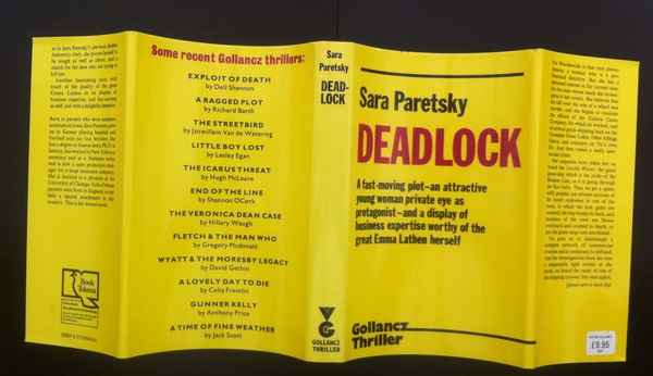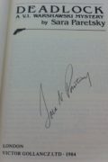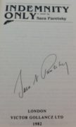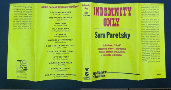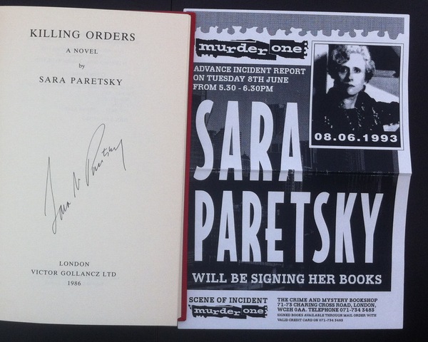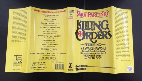 The first three books in in the hugely successful 'V.I. Warshawski' Series.All three books are first UK printings published by Gollancz.Vol 1:'Indemnity Only' which was published in 1982.Both the BOOK and WRAPPER are in near FINE condition. Previous owner's name to first blank end paper and one small light mark to lower text block..Vol 2: 'Deadlock' which was published in 1984.Both the BOOK and WRAPPER are in near FINE condition. Publisher price sticker to lower front flap.Vol 3:'Killing Orders' which was published in 1986..Both the BOOK and WRAPPER are in near FINE condition. Publisher price sticker to lower front flap.All 3 wrappers are protected in removable Brodart archival covers.All 3 books have been SIGNED to the title page by SARA PARETSKY.The flyer for the signing event accompanies these titles as provenance.The first three books in the hugely successful V.I.Warshawski series.A very attractive set.