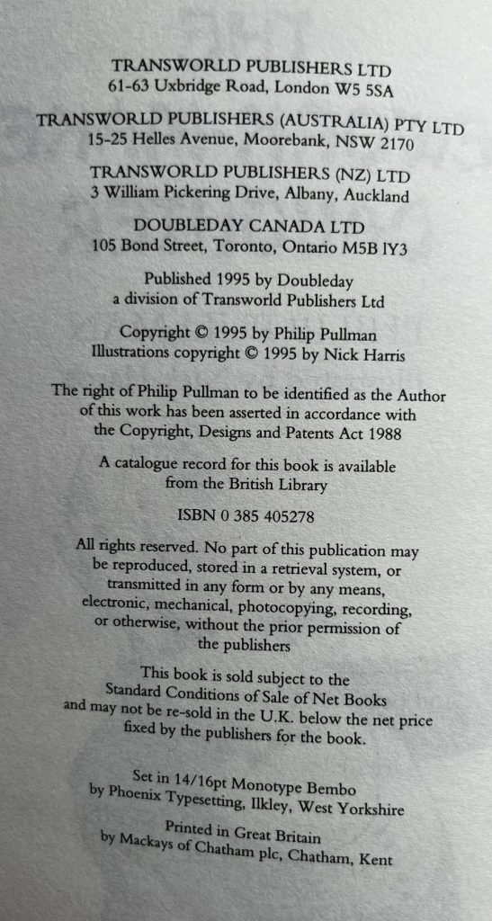The First UK printing published by Doubleday, London in 1995. The BOOK is in near Fine condition. A minuscule rub to the rear lower spine fold otherwise the book is in excellent condition. The binding remains very tight. The laminated boards remain very bright and there is NO fading of the yellow lettering to the spine which is commonly encountered. A title page from another first edition copy has been signed (without dedication) by Philip Pullman and affixed to the front blank end-paper. Profusely illustrated throughout in B/W by Nick Harris. No wrapper as issued. The book is protected in a loose archival Mylar cover. One of the scarcest Pullman titles with most copies having entered the library system. Accompanied by the Lyric Theatre Flyer for the theatre adaptation of this story which is loosely inserted and is in Fine condition. Collectible.