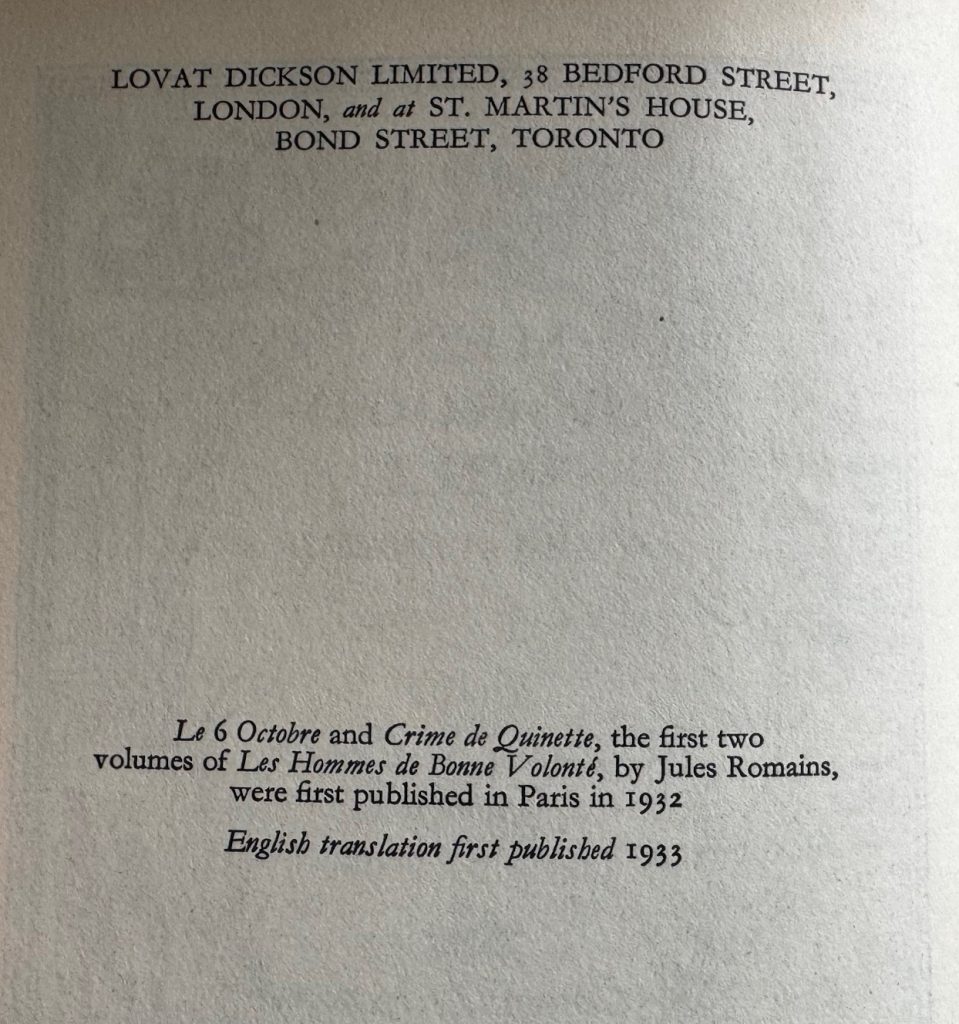 Twelve Books In 9 Volumes. All the books are the First UK printings published by Lovat Dickson, London between 1933 and 1937. Translated by Warre B. Wells and Gerard Hopkins. Twelve volumes in nine, totalling over 3,500 pages, the first seven volumes with pictorial title page designed by Rex Whistler, the title page of the last two volumes printed in red & black, index of characters to each volume and some volumes with advertisements at the rear. The BOOKS are in Very Good++ or better condition. Original publisher's red cloth, spines lettered in gilt; top edges red (mostly faded). Free from inscriptions. Light toning and spotting to the text-block with a little offsetting to the blank end-papers. Some light spotting in places to some volumes. The WRAPPERS are complete and in Very Good++ or better condition. They are slightly marked and spotted in places. Some of the edges are lightly rubbed and split, with a couple of tiny chips and a little toning to the spines. The wrapper of book 6 has a slight amount of silver-fishing to the rear panel. All wrappers are protected in removable archival protectors. The title page and wrappers designs are all by Rex Whistler except for books 8 and 9 which were only issued bound with the U.S.A sheets and a different title page design. Some publisher's ephemera loosely inserted in some volumes. The first twelve books (Volumes I, VIII & IX each contain two books) of Jules Romains' epic roman-fleuve, originally published in French in 27 volumes. In America, the full sequence was published by Knopf in 14 volumes, but in the U.K. it remained incomplete. In 1938 Lovat Dickson sold his publishing company to Peter Davies, who issued a few further volumes, ending with Book 18. Jules Romains was the pseudonym of French novelist, poet and dramatist Louis Henri Jean Farigould (1885-1972). He was nominated for the Nobel prize in literature sixteen times. Very scarce to find such a compete set with such attributes.