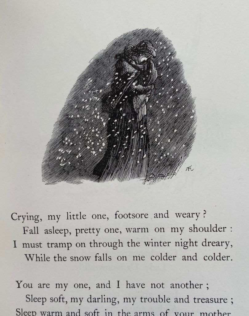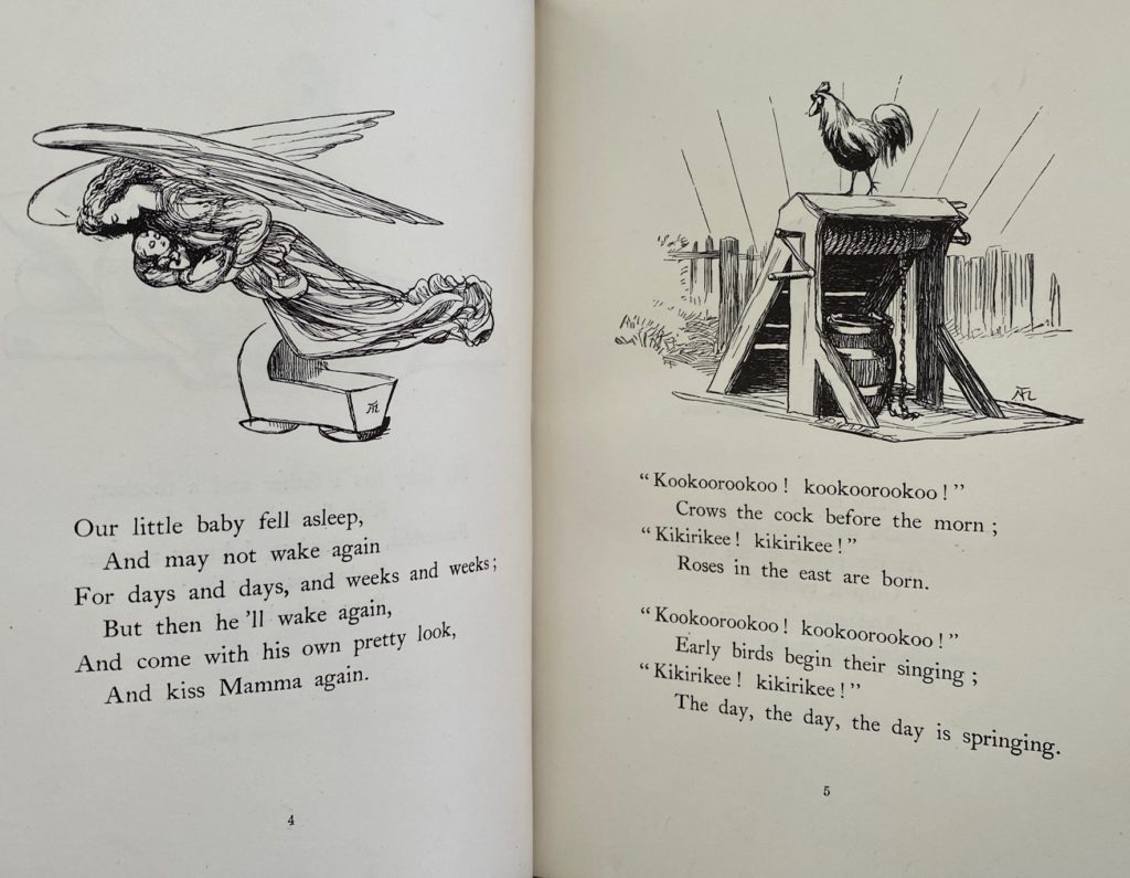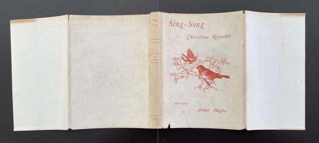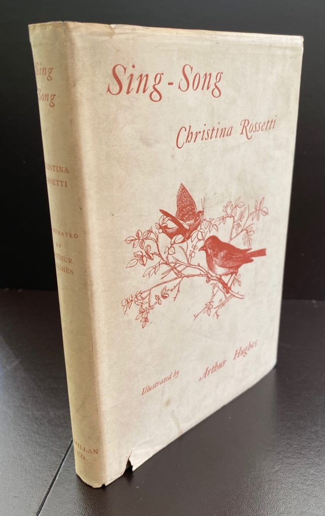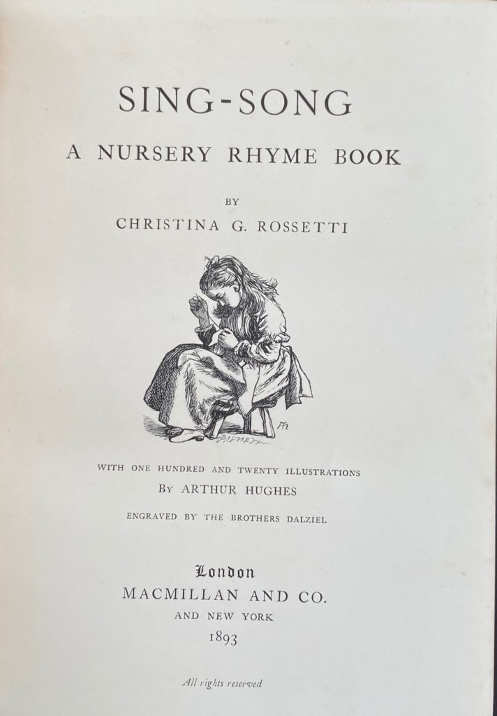 The First UK printing published by Macmillan and Co, London in 1893 of this new and enlarged edition. The BOOK is in Very Good++ condition. Original green ribbed moiré silk cloth, titles gilt to spine, all edges gilt. The spine is very lightly toned. The edges, corners and folds are mildly rubbed with a little light markings to the covers. Offsetting to the blank end-papers. One penned gift inscription dated 1912 to the front blank end-paper, otherwise internally very clean with just a few light spots in places. The WRAPPER is complete and is in Very Good+ condition. Slight loss at the corners and at the upper spine tip. Light age related markings with a light spotting in places. A little creasing to the edges. Light dustiness and toning to the spine. The red lettering is only lightly faded. A closed tear to the rear upper spine and rear flap folds. A small area of loss to the lower front cover edge. The wrapper looks very attractive in the removable Brodart archival cover. The New and enlarged edition of Christina Rossetti's illustrated book of nursery rhymes with 120 illustrations by Arthur Hughes, engraved by the Brothers Dalziel. Rossetti's nursery rhymes were first published in 1872, but was expanded for this edition, retaining the charming illustrations of Arthur Hughes. Most of the B&W Ink Illustrations, by Arthur Hughes take up almost half a page. The full page tissue guarded frontispiece illustration shows a mother singing to her baby, in a pastoral setting. Extremely scarce to find in collectible condition with the original wrapper.