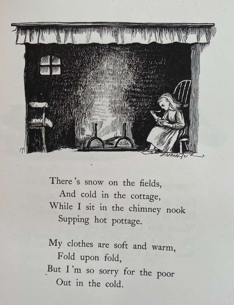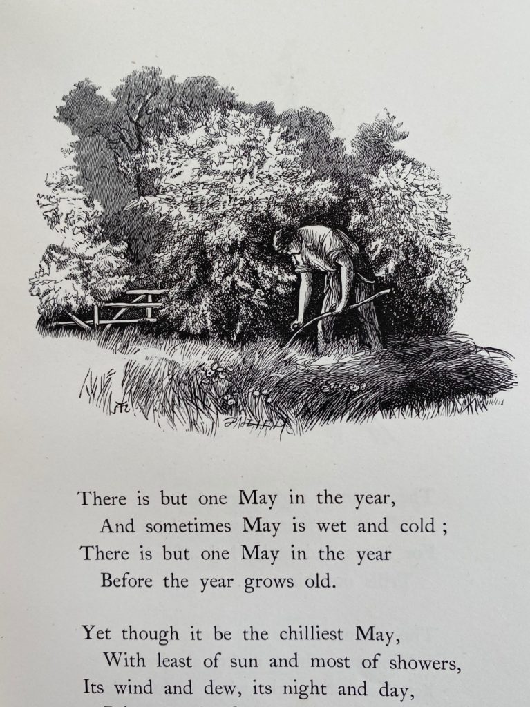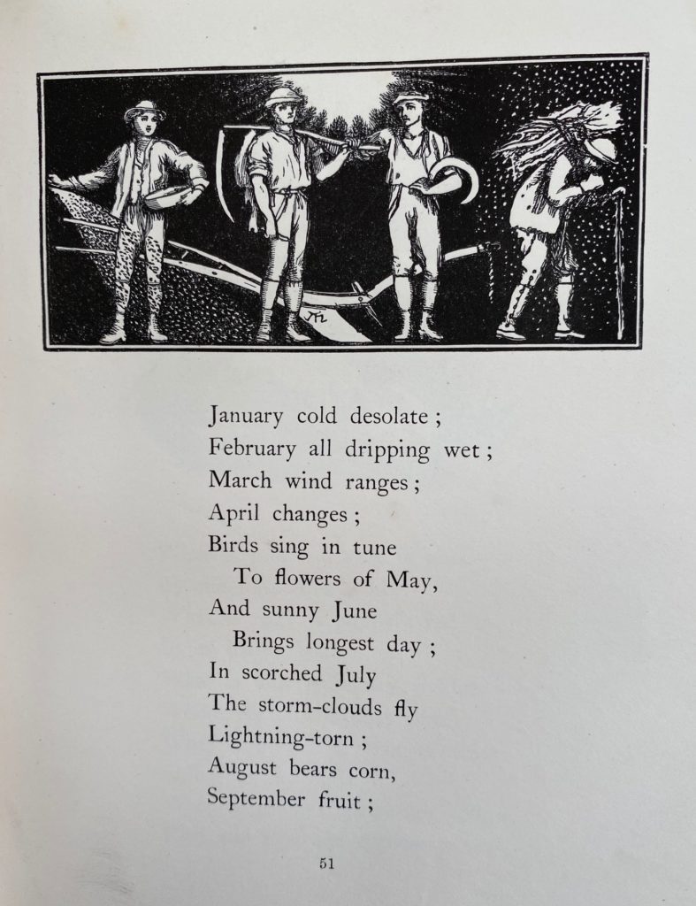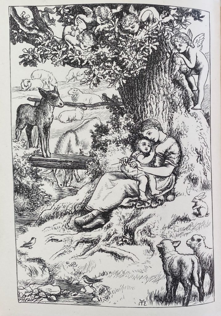 The First UK printing published by Macmillan and Co, London in 1893 of this new and enlarged edition. The BOOK is in Very Good++ condition. Original green ribbed moiré silk cloth, titles gilt to spine, all edges gilt. The spine is very lightly toned. The edges, corners and folds are mildly rubbed with a little light markings to the covers. Offsetting to the blank end-papers. One penned gift inscription dated 1912 to the front blank end-paper, otherwise internally very clean with just a few light spots in places. The WRAPPER is complete and is in Very Good+ condition. Slight loss at the corners and at the upper spine tip. Light age related markings with a light spotting in places. A little creasing to the edges. Light dustiness and toning to the spine. The red lettering is only lightly faded. A closed tear to the rear upper spine and rear flap folds. A small area of loss to the lower front cover edge. The wrapper looks very attractive in the removable Brodart archival cover. The New and enlarged edition of Christina Rossetti's illustrated book of nursery rhymes with 120 illustrations by Arthur Hughes, engraved by the Brothers Dalziel. Rossetti's nursery rhymes were first published in 1872, but was expanded for this edition, retaining the charming illustrations of Arthur Hughes. Most of the B&W Ink Illustrations, by Arthur Hughes take up almost half a page. The full page tissue guarded frontispiece illustration shows a mother singing to her baby, in a pastoral setting. Extremely scarce to find in collectible condition with the original wrapper.