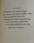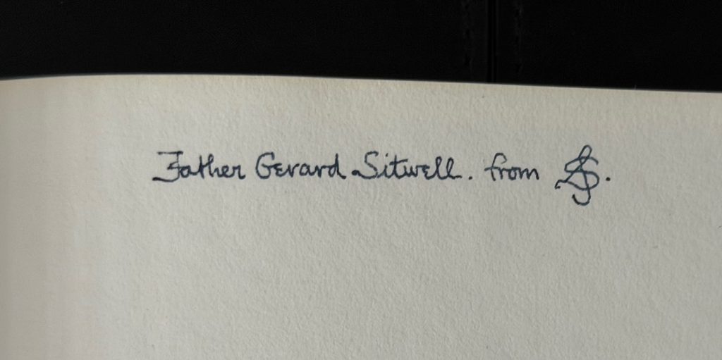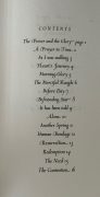 The First UK Printing published by Stanbrook Abbey Press, Worcester in 1960. Large 8vo., quarter vellum over blue and gold marbled paper-covered boards; spine lettered in gilt; together in the very scarce original glassine wrapper. The lower edge untrimmed; lettered in blue, black and red throughout, with decorative initials, as well as title vignette and first initial in 'The Power and the Glory' ("Let there be life") in gold; together with his 1960 poem 'Awaitment' loosely tipped in; The BOOK in excellent near fine condition, lightly rubbed at edges of boards and corners; the glassine WRAPPER chipped and torn with a large portion of loss at head, but seldom found at all. The wrapper is protected in a removable Mylar cover. Limited edition. Number '290' of just 480 copies on W.S.H. handmade paper with hand-lettered initials and gilding by Margaret Adams. Handset in Jan van Krimpen's Romulus Cancelleresca Barstarda and printed during September and October 1960. The binding by George Percival and Rigby Graham. This copy additionally inscribed by Siegfried Sassoon to the front free endpaper : "Father Gerard Sitwell, from [cipher] SS". The recipient was likely Dom Gerard Sitwell, monk of Ampleforth Abbey and editor of the works of medieval mystic writers, who was Master of St Benet's Hall, Oxford from 1947-64. Sassoon lived in Oxford during the inter-war years, and in 1965 received an honorary degree from Oxford University. A collection of poems which include verses penned between 1916 and 1960, thereby representing a broad scope of the writer's literary offerings. They include such verses as 'As I was Walking' (1926), 'Morning Glory' (1916) and 'Nativity' (1925) and many of them reflect his faith - he had in 1957 converted to Catholicism after many years of grappling with his faith and spirituality. Predominantly known today for his war poems, Sassoon continued to write long after the end of the Second World War in 1945. He became increasingly involved in politics and took up a post as literary editor of the socialist newspaper the 'Daily Herald'. He traveled extensively throughout Germany. He began to branch into prose, with 'Memoirs of a Fox-Hunting Man' appearing in 1928, and 'Memoirs of an Infantry Officer' and 'Sherston's Progress' appearing a few years later, though he continued to write poetry throughout this period, publishing a series of collections throughout the 1920s -1950s. This represents one of his final poetry collections before he passed away in 1967. A beautifully-presented collection of poems, rare indeed inscribed thus, and with the original glassine.
