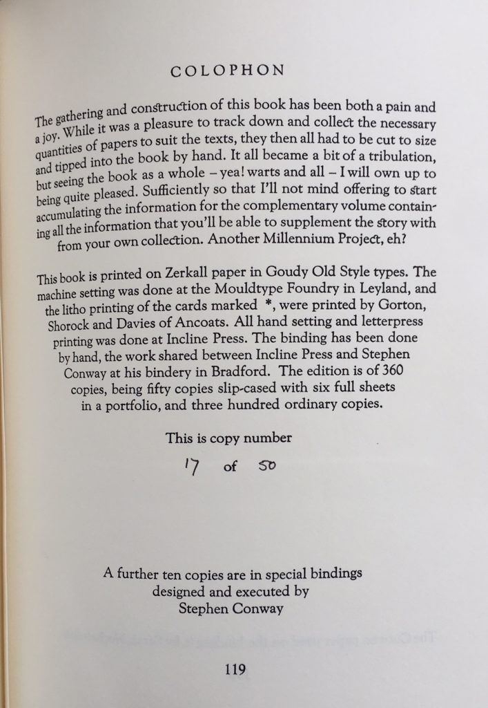 The Sole UK printing published by Incline Press in 1997. The BOOK is in Fine condition. Number 17 of only 50 special copies with the total limitation being 360 copies. This special edition has six loose full sheets of patterned paper housed in a separate paper portfolio. The book and portfolio are housed within the slipcase which is in near Fine condition. The slipcase decoration has a different patterned design to the Standard edition. The six full sheets of patterned papers are from The Curwen Press, Judd Street Gallery, Rampant Lions Press et al. The sheets are in Fine condition. The book 'is printed on Zerkall paper in Goudy Old Style types. All hand setting and letterpress printing was done at Incline Press. The binding has been done by hand, the work shared between Incline Press and Stephen Conway at his bindery in Bradford'. Accompanied by the scarce Publisher's prospectus. A wonderful production with numerous tipped in patterned paper samples. Extremely scarce. More images available on request.