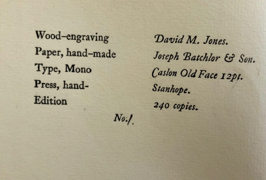 The sole UK printing published by St. Dominic's Press, Ditchling in 1930. The BOOK is in near Fine condition. This is number '1' of a total edition size of only 240 copies. Light pushing at the spine ends and some tiny rubs to the rear panel and upper edge spine cloth. Tiny amount of spotting to the text-block. Free from inscriptions and erasures. Publisher's errata page present. Batchlor & Sons hand made paper printed on the Stanhope Press. Full page wood-engraving 'The Bride' and title page decoration by David Jones. In 'A Survey of the Engravings of David Jones' page 19, Cleverdon wrote ' To the end of his life, David was particularly fond of this engraving'. It was a remaking of a failed first illustration for 'The Ancient Mariner' in which he had wanted to evoke a nun taking the veil. He set off whites and greys against 'very small areas of solid black'. In one Romanesque window, apparently echoing the curves of the bride's breasts, appears the hart of Psalm 42. Dilworth also points out that her high forehead is Petra's but her groom is the Saviour with whom Jones identified. (Cleverdon E200: Taylor and Sewell A201 : Dilworth, David Jones pp1178). Protected in a loose Mylar archival cover. Very scarce.