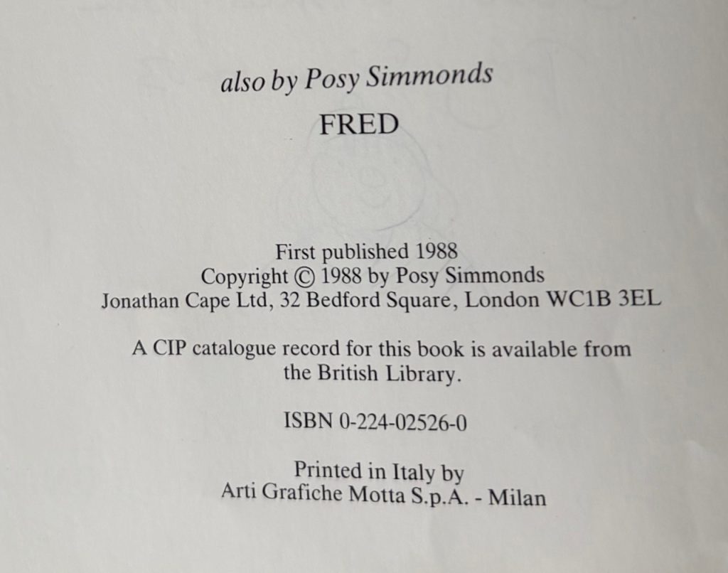 The First UK Printing published by Jonathan Cape, London in 1988. Large 4to., original laminated publisher's boards featuring an illustration of the protagonist in her red jacket to the upper cover; decorative cherub endpapers; profusely illustrated throughout with numerous full colour illustrations by Posy Simmonds; The BOOK near Fine, just very lightly bumped at spine ends and the upper corner; issued without a wrapper. First UK edition of Simmond's first book following the success of 'Fred' (1987). This copy inscribed on the half-title page by the author 'Best Wishes from Posy Simmonds', with an original pen and ink sketch of Lulu beneath. The British Cartoonist and illustrator Posy Simmonds is perhaps best known for her long association with The Guardian, for which she drew the series Gemma Bovery (2000) and Tamara Drewe (2005–06), both of which were later published as books. This children's story predates those publications by many years, and centres around a young girl, whose father refuses to let her play in the snow-covered park. Dragged instead to a museum, she meets a talking cherub statue, who flies her on a series of adventures within the paintings in one of the galleries. A bookmark for the Smarties Prize in 1988, for which this book was shortlisted in the category of 6-8 year olds, is loosely inserted. Protected in a removable Mylar cover.