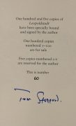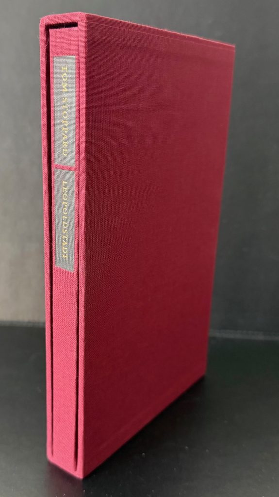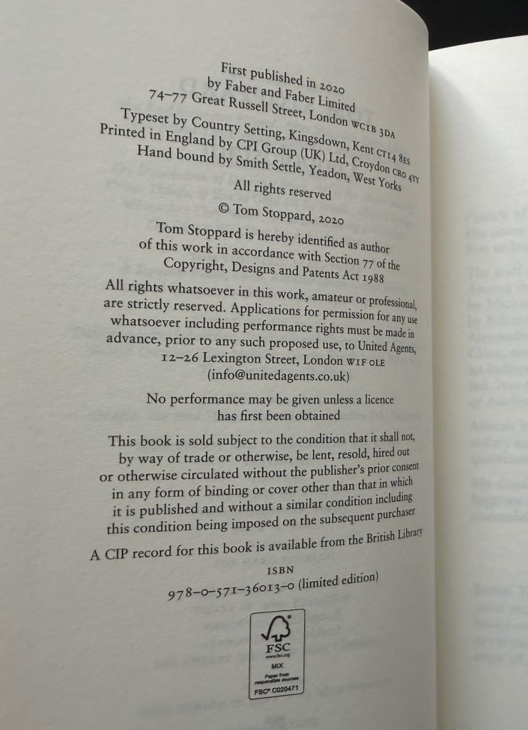 The First UK printing published by Faber, London in 2020. Number '60' of only 100 slipcased copies specially bound, numbered and signed by the author to the limitation page. The BOOK is in Fine condition and is unread. The book has only been opened to photograph these images. The maroon publisher's plain slipcase is in Fine condition. No wrapper as issued. Still housed tin the publisher's original paper wrapping with matching numbered label. This signed limited edition was issued simultaneously with the publisher's trade edition. Tom Stoppard's latest play which opened at the Wyndham's Theatre in January 2020 to high acclaim. Accompanied by the original Wyndham Theatre Flyer card for the theatre production. An extremely elusive title with such attributes now. Collectible.