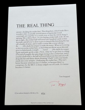 Stoppard, Tom ~ ‘The Real Thing’ : A Broadside From The 1982 Play ‘The Real Thing’ : The Famous Cricket Bat Speech : Numbered Limited Edition Of Only 500 Copies, Each Signed By Sir Tom Stoppard