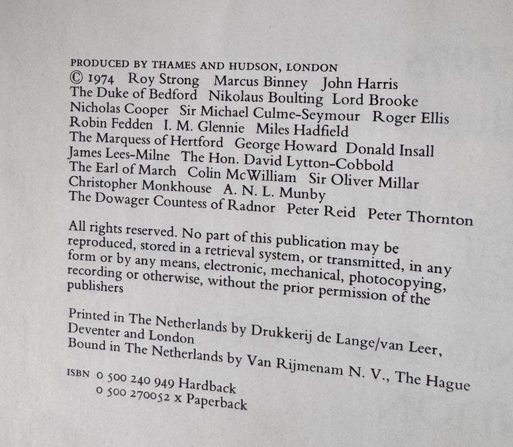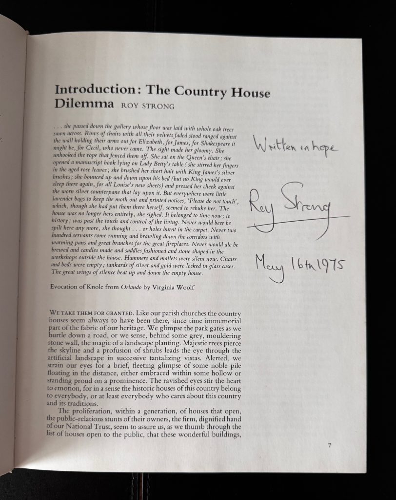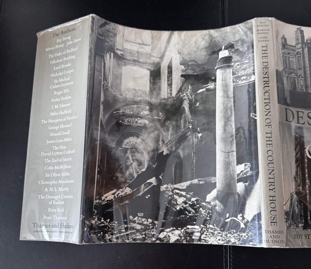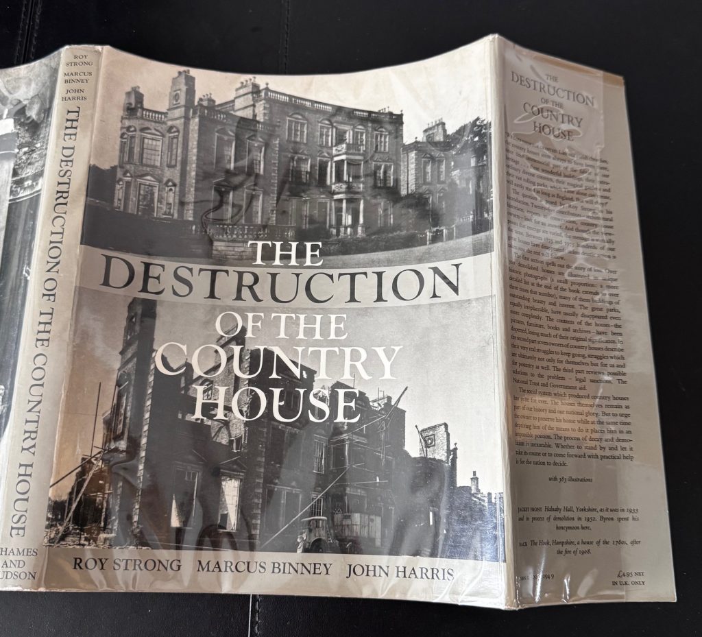 The First UK printing published by Thames & Hudson, London in 1974. Large 8vo., brown cloth lettered in gilt to spine with publisher's device in gilt embossed to the upper cover; together in the unclipped photographic wrapper (£4.95 net) featuring Halnaby Hall in Yorkshire before and in the process of demolition; and The Hook in Hampshire, shortly after the 1908 fire; profusely illustrated throughout with 383 black and white photographs; The BOOK with faint offsetting to the end-papers, else essentially a Fine copy; The WRAPPER with some minor creasing and rubbing to edges, else near Fine. The wrapper is protected in a removable Brodart archival cover. This copy inscribed by Roy Strong to the first page of his introduction (entitled 'The Country House Dilemma') with the pertinent quote "Written in hope... May 16th 1975." A work on the loss of English country houses, with twenty-five contributions from architects, historians, owners and experts in conservation. Tracing the destruction of 300 such houses over the period of one hundred years between 1875 and 1975, the work discusses the additional loss of estate grounds, including great parks and the dispersal of art, library and furniture collections. The final section discusses possible solutions to the problem, which include legal sanctions and Government aid, as well as the importance of the National Trust. The front cover shows Halnaby Hall in Yorkshire, where Lord Byron spent his honeymoon, in 1933 and at the point of its demolition in 1952. (Sir) Roy Strong is an English art historian and museum curator who was appointed as assistant keeper of the National Portrait Gallery in London in 1959, and became its Director in 1967, a post which he held until 1973, when he went on to become the youngest director of the Victoria and Albert Museum. The present title was derived directly from an exhibition held at the V&A in 1974, which included a 'Hall of Destruction', decorated with falling columns and pictures of many of the country houses which had been demolished since 1875. It was Strong's belief that drawing public attention to the impact of these demolitions (caused, in part, by rising costs, lack of funding, and government requisitioning during the Second World War), would bring about greater awareness, and encourage protection for the houses which remained. The landmark exhibition led to the founding, the following year, of 'Save Britain's Heritage', and two further related exhibitions followed; 'Change and Decay: The Future of our Churches' in 1977, and 'The Garden: A Celebration of a Thousand Years of British Gardening' in 1979. Contributors here include James Lees-Milne, Marcus Binney, the Duke of Bedford, the Marquess of Hertford, George Howard, and many others. "What we give in this book is a tract for the times", Strong writes, "I have felt deeply that we should gather together the viewpoint from within as well as from without; that is, the experiences of those who actually struggle to live in a great house in addition to those of various experts, whether on the building, the gardens, the picture collection or the libraries... one is not concerned with the past, with a nostalgic looking back to a golden age gone for ever, but with the present and the future." A very scarce title in this casebound format.