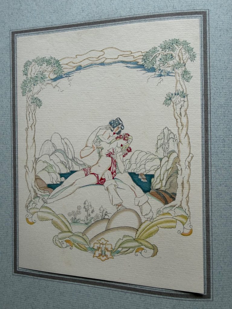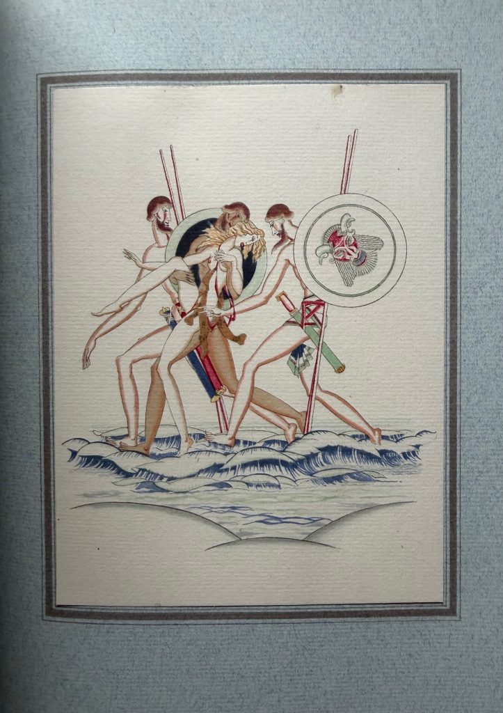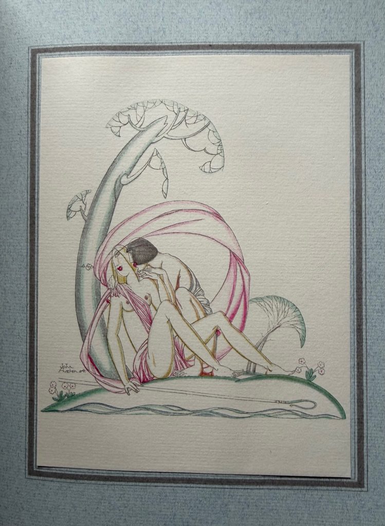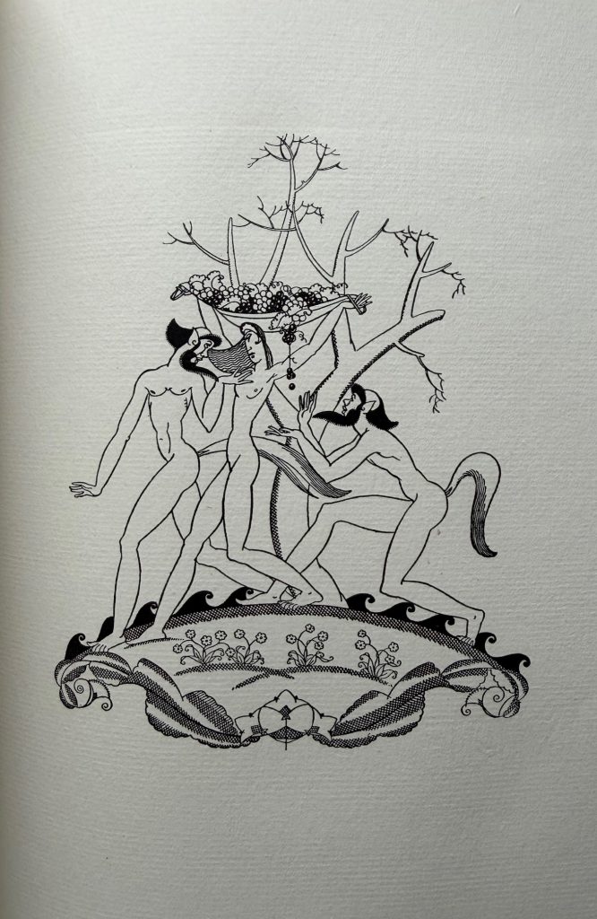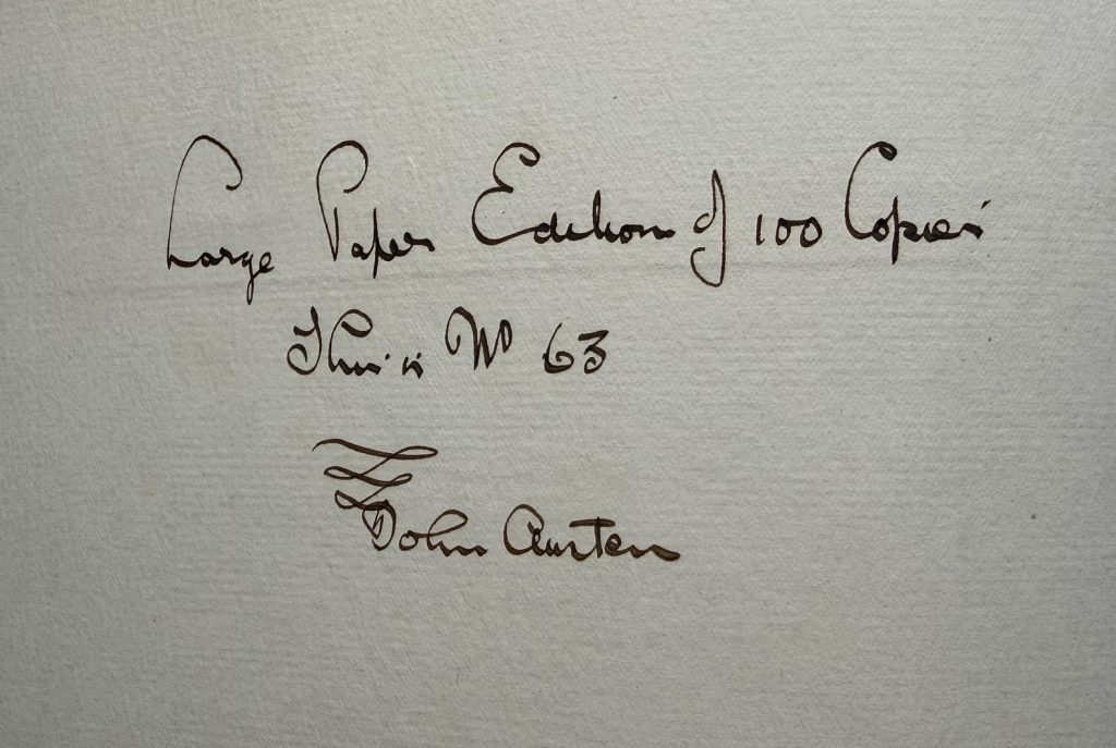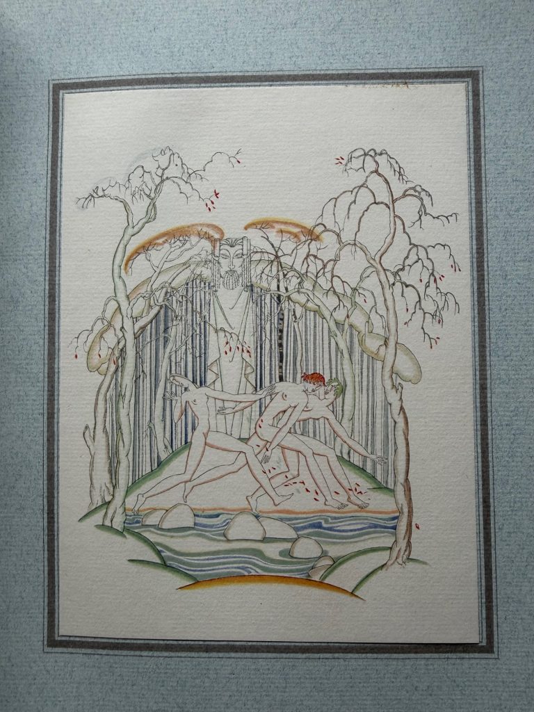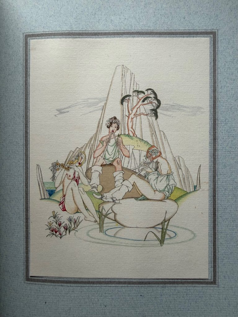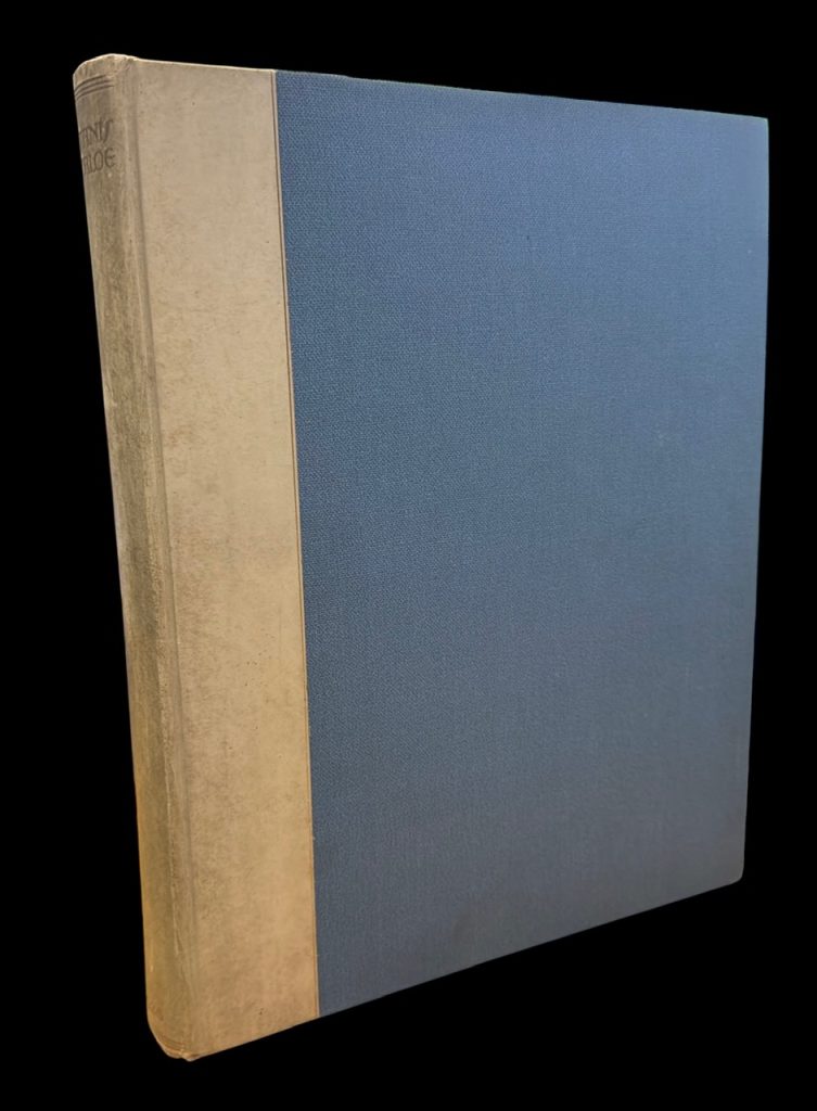 The First UK Printing published by Geoffrey Bles, London in 1923. Folio., publisher's vellum-backed blue buckram boards, spine titled and ruled in gilt with date to foot; upper edge gilt, else untrimmed; with frontis and a further 11 plates in full colour, all tipped on to textured blue paper with double borders; title vignette and another 9 black and white illustrations direct to page, including some full page, as well as head and tail pieces; the text printed on Abbey Mills watermarked paper; The BOOK a beautiful, clean copy, with slight toning to the untrimmed fore-edge, a couple of odd spots internally, and the spotting occasionally encroaching onto the outer margin of the page edges towards the second half of the text, but the plates remain clean ; vellum a trifle mottled and marked as inevitably encountered ; the cloth lightly bumped at corners, but otherwise an exceptional example of a scarce work, which was issued without wrapper. The book is protected in a removable Mylar cover. The Limited edition with 'Large Paper Edition of 100 Copies / This is No. 63' written in ink by John Austen's flowing hand to one of the endpapers, above his equally flowing signature. The story of Daphnis and Chloe is one of disputed authorship. Written during the time of the Roman Empire, its authorship is attributed to the Greek sophist Longus, but even today little is known about this writer's life. The first translation has been traced to a French edition, published in 1559, and it appeared in English shortly after, in 1587. The story follows a young boy and a young girl, each abandoned at birth, who are adopted by a goatherd and a shepherd, respectively, and grow up together, herding their step-parents' flocks and eventually falling in love. Becoming separated, abducted and beaten, they eventually find their way back to each other. The tale went on to inspire a number of other stories, including the 'Aminta' of Tasso and Alan Ramsay's 'Gentle Shepherd'. It is widely considered to be the first pastoral prose romance. The text is here accompanied by a series of (often erotic) plates designed by John Austen. Austen was born in 1886, and his early artworks were undoubtedly Beardsleyesque in style. The illustrations provided here lean more towards the Art Deco in design, which were carried out towards the middle of his long career as a designer and engraver. Exceedingly scarce in this deluxe edition. I can trace only one other copy at auction within the last 30 years.