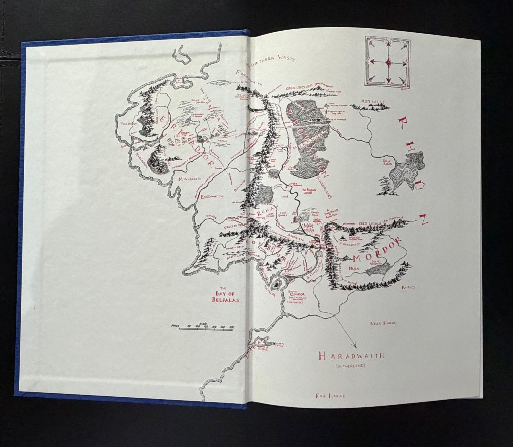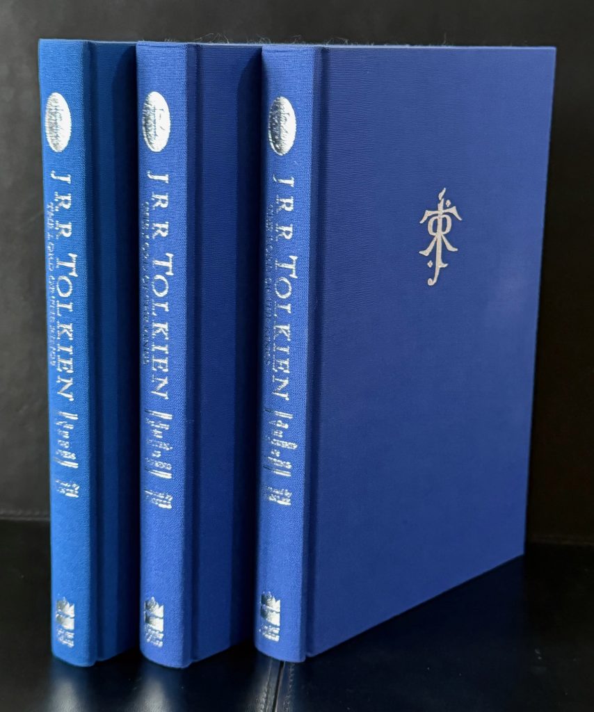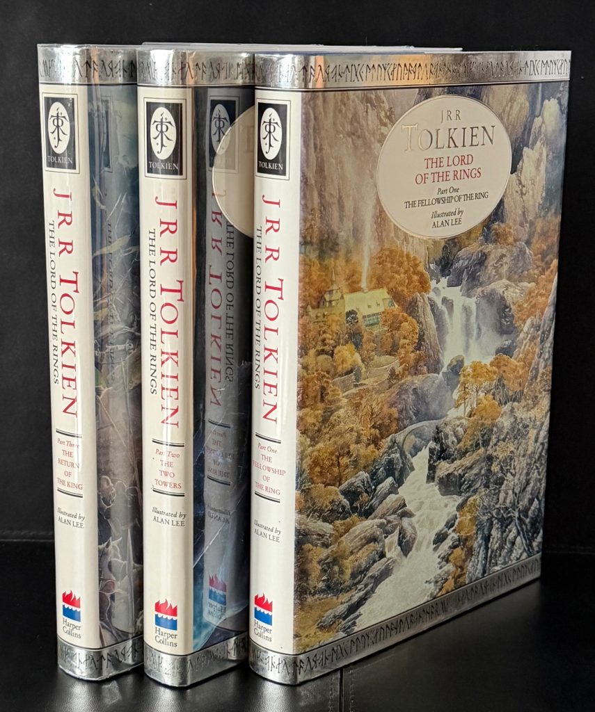 The First UK Printings Thus. published by Harper Collins, London in 1992. Large 8vos., 3 vols.; navy blue publisher's cloth with Tolkien's monogram symbol embossed in silver to upper boards; spines repeating the monogram with lettering and lining in silver, along with publisher's devices; decorative endpaper maps; together in the highly decorative wrappers, all unclipped (£17.99 to front flaps); illustrated throughout with frontispieces and numerous full-page illustrations in full colour by Alan Lee; The BOOKS are all in very near Fine condition. The WRAPPERS are all in very near Fine condition, with just a couple of tiny marks and scuffs; excellent overall. All wrappers are protected in removable Brodart archival covers. First UK editions thus, of Tolkien's celebrated and revered fantasy trilogy, which has become something of a cult classic, and one of the best-known works of the 20th century. Originally published the previous year as a one-volume omnibus, this edition is the first to feature Lee's captivating illustrations in the same three-volume format as the epic was originally published. Sadly lacking the publisher's slipcase. The set is here enhanced with the wonderfully enigmatic illustrations by Alan Lee, who portrays numerous sweeping scenes from the text, as well as characters such as Gollum, Gandalf and the elves, epic battles, trolls, dwarfs, orcs and much more. Lee went on to illustrate many other Tolkien works, including a 1999 edition of The Hobbit, the 2007 edition of The Children of Húrin, the 2017 edition of Beren and Lúthien, the 2018 edition of The Fall of Gondolin, and the 2022 edition of The Fall of Númenor. He was also employed as the concept artist on Peter Jackson's 2001–2003 The Lord of the Rings film trilogy. A wonderful gift set. Due to the weight of these three books, there will be extra international shipping costs to pay for - please make contact for further information regarding this .