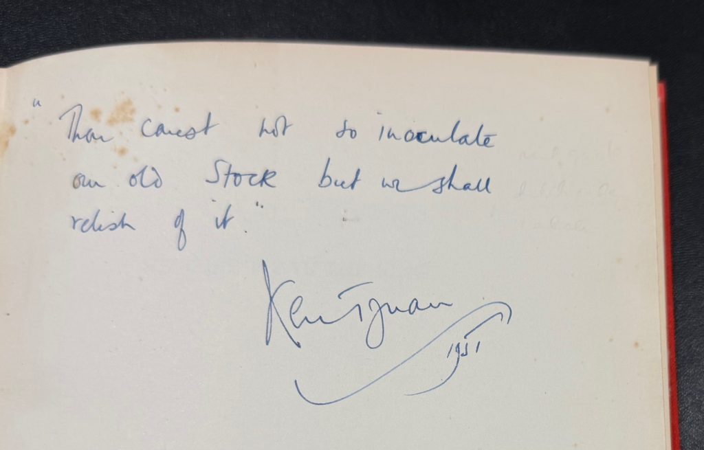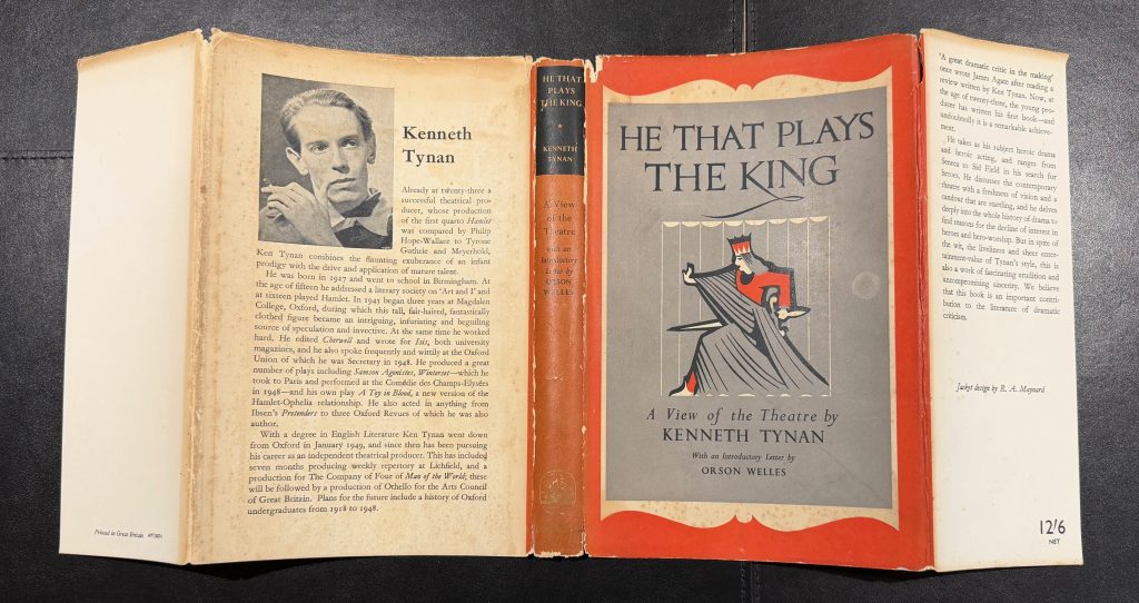 The First UK printing published by Longmans, Green and Co Ltd., London in 1950. 8vo., bright red cloth with contrasting painted black label to spine gilt; upper edge top-stained red; together in the unclipped pictorial wrapper (12/6 net to front flap) designed by R. A. Maynard; with black and white frontis photograph showing 'Akh-na-ton / The Prototype'; The BOOK near Fine, square and tight with light bumping to spine tips, and light spotting to the prelims/outer edges of the text block; The WRAPPER is in Very Good+ condition ; lightly spotted and toned, more-so to the lower panel, with some rubbing and a little loss to tips of spine and folds, but not affecting any lettering; A 3cm closed tear to the front flap fold. The wrapper is protected in a removable Brodart archival cover. This copy has been signed and lined with an adapted Hamlet quotation by the author to the front blank end-paper : "Thou carest not to inoculate, our old stock but we shall, relish of it , Kenneth Tynan". The original Shakespeare quotation reads : You should not have believed me, for virtue cannot so inoculate our old stock but we shall relish of it. I loved you not." (Hamlet Act 3, Scene 1). Tynan's first book and carries an 8 page 'An introductory letter to the author' by Orson Welles as the fore-word. Written by Tynan when he was just 23, which takes as its subject, heroic drama and acting, delving into the question of why audiences were beginning to turn away from hero worship. Tynan (1927-1980) loved Hamlet, having first played the lead role at the age of sixteen. Outspoken and flamboyant from an early age, and advocating repealing laws against homosexuality, he was hired as a theatre critic for the Evening Standard and the Observer, and became a fearsome reviewer. He was later appointed the new National Theatre Company's literary manager in 1963. An important contribution to dramatic criticism. Scarce with such attributes.