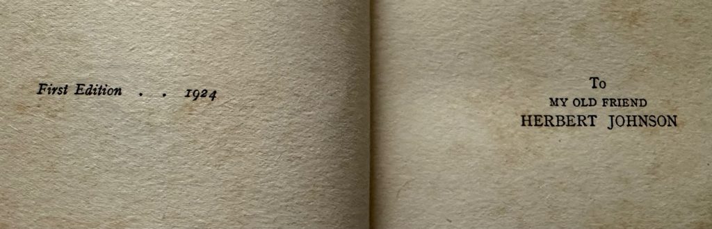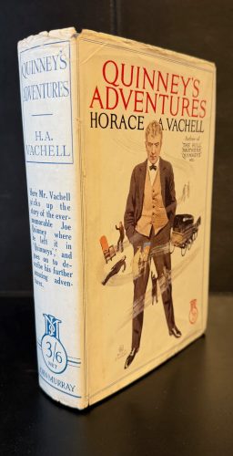 The First UK printing published by John Murray, London in 1924. 8vo., blue publisher's cloth, lettered in black to upper board, and gilt to spine; with decorative borders to both; central decorative motif to upper cover; together in the pictorial wrapper by Philip Simmonds, priced 3/6 net to spine; author's woodblock device to title; The BOOK is in Very Good+ condition with pushing at the spine tips with two small bumps to the upper edges of the boards ; endpapers lightly offset; spotting to outer edges and prelims, encroaching onto the first and last few pages, and a couple of spots sporadically throughout due to the cheap quality of the paper stock used; light ownership name in purple ink to half title; the Very Good++ WRAPPER with a couple of small losses and nicks to edges, and a little more so to the head of spine; a little shelf wear, but else in superior condition; discretely repaired internally with tape. The wrapper is priced '3/6' to the spine and may possibly be the second state issued with the first issue book. The wrapper is protected in a removable Brodart archival cover. Horace Annesley Vachell (1861 – 1955) was a prolific writer of novels, plays, and essays, beginning with 'A Drama in Sunshine' (1898) and ending with 'Averil' in 1945. Educated at Harrow and Sandhurst, Vachell later traveled to America, where he married, became a partner in a land company, and is often credited with introducing the game of Polo to Southern California. Returning to England at the turn of the century, Vachell began to write, mostly inspired by his early life and friendships at Harrow, one of the most popular being 'The Hill' (1905) which explores themes of friendship, youth and identity whilst boarding at the prestigious English school. Vachell also penned a number of successful plays, of which 'Lord Camber's Ladies' (1932) was adapted into film by Alfred Hitchcock. In 1914, he produced the comedy-drama play 'Quinneys', which became one of his most successful works. Following the exploits of Joseph Quinney, an endearing but stubborn patriarch of a family of antiques dealers, it led to a series of novels following the family's adventures, of which this is the second in the series. The main character Joseph Quinney is based on the real-life antique dealer Thomas Rohan (1860-1940). Often compared with John Galsworthy for his quintessentially British writing, his works remain little-known today, though early copies such as this are considerably scarce in the wrapper.