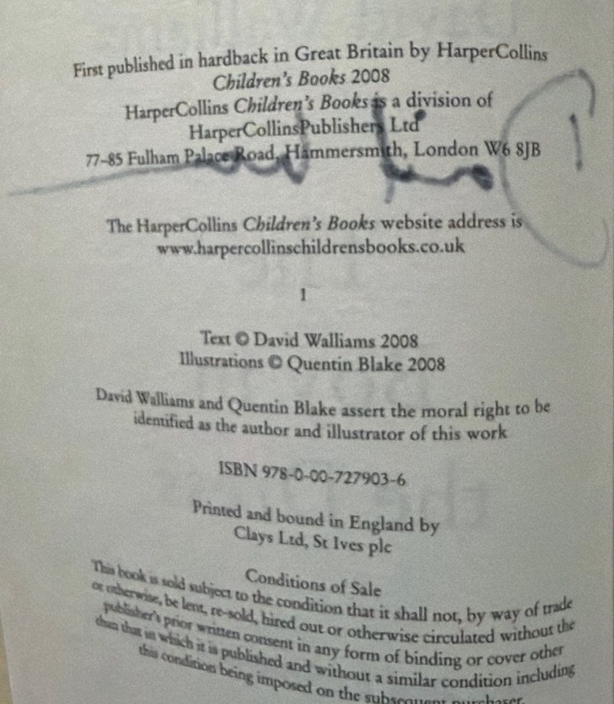 The First UK Printing published by Harper Collins Childrens Books, London In 2008. Octavo pp. 231, [9]. The BOOK is in near Fine condition and appears unread. The Wrapper is in like near Fine condition and is protected in a removable Brodart archival cover. A 'signed by the author' sticker to the front panel. Illustrated throughout in B/W by Quentin Blake. Publisher's ivory-white laminated pictorial boards in a purple unclipped pictorial dustwrapper. Striking illustrated endpapers. The wrapper is correctly priced '£12.99' to the inside flap, as called for. The first edition of the author's debut book, boldly signed ( without dedication) by David Walliams to the title-page. A wonderful tale of tolerance and being different. A modern classic lovingly illustrated throughout by Quentin Blake. Collectible.