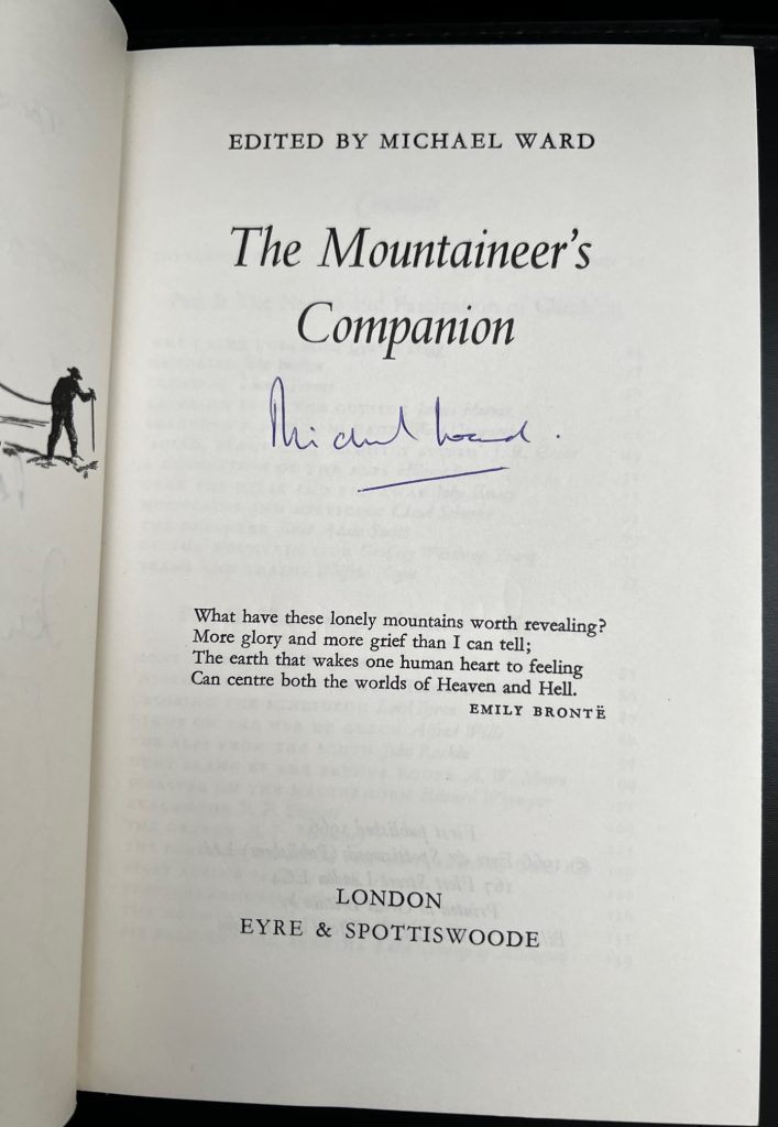 The First UK printing published by Eye and Spottiswoode, London in 1961. The BOOK is in near Fine condition with just a little pushing to the spine ends and slight fading to the blue top-stain. The WRAPPER is complete and is in near Fine condition with just some fading of the blue colouring to the spine. The wrapper is protected in a removable Brodart archival cover. The book has been signed by the editor, Michael Ward to the title page. Additionally signed on the half-title by an array of mountaineers and travel writers : George Lowe, Edmund Hillary, Alfred Gregory, Ian McNaught-Davis, Maurice Herzog, Walter Bonatti and Jan Morris. Hillary, Gregory and Lowe were fellow mountaineers on the first successful ascent of Everest expedition in 1953. James (later 'Jan') Morris was The Times Newspaper correspondent on the same expedition and broke the successful ascent news to the world. 2023 marked the 70th anniversary of this milestone event. The original publisher's Prospectus is loosely laid in. A selection of prose and poems, with sections devoted to the Alps, Everest, the Himalayas and other ranges. Central colour plate, 24 B/W plates and coloured end-papers. 22 line drawings and 3 maps in the text. A sharp copy and very elusive with such attributes