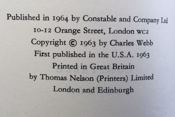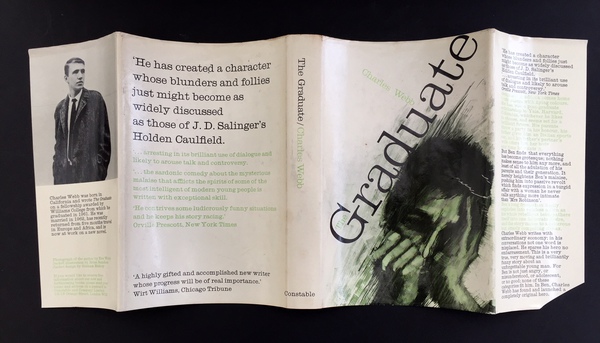 The First UK Printing published by Constable in 1963. The BOOK is in near FINE condition. The covers are clean with bright gilt lettering. A few spots and mild toning to the text block. Small bookseller sticker to lower front pastedown. Free from inscriptions, erasures and markings. The WRAPPER is price clipped and is in VERY GOOD++ or better condition. Mild age related toning and soiling. Two superficial scratches to the front cover (which are hardly noticeable as they blend in with the wrapper artwork). The Brian Sanders wrapper artwork looks very striking in the removable Brodart archival cover. The author's iconic debut novel which became the runaway bestseller and successfully filmed starring Anne Bancroft and Dustin Hoffman. A very sharp copy and extremely scarce as the First UK edition.
