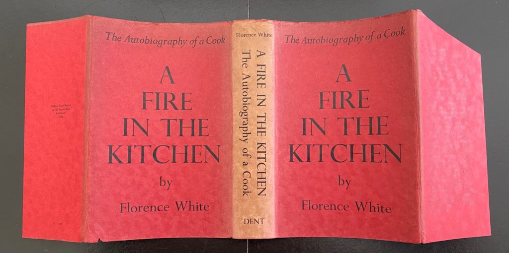 The First UK printing published by Dent, London in 1938. The BOOK is in Very Good++ or better condition. Very light pushing at the extreme spine ends. Gilt titling to the spine with the publisher's blind stamped details to the lower spine as issued. Some toning to the text-block and outer page edges due to the quality of the paper stock used. Some spotting to the prelims and light offsetting to the blank end-papers. Free from inscriptions. The scarce WRAPPER is neatly price-clipped and is in Very Good+ condition. A little nibbling to the upper spine tip. Some fading of the red colouring to the spine. The wrapper remains very striking in the removable Brodart archival cover. Florence White was the founder of the English Folk Cookery Association. Born in 1863, White's somewhat unhappy childhood, shopping 'economically for food (since the family was by then poor), waiting on her uncongenial stepmother, and teaching the three small children of her father's third marriage' (ODNB), was relieved when she was sent to Fareham 'to nurse her father's two elderly sisters, formerly proprietors of the Lion Hotel and Assembly Rooms. From them, as she later described in her autobiography, she learned that 'good epicurean country-house cookery which had been handed down the family from mother to daughter since the days of Queen Elizabeth'. Her return to Fareham towards the end of her life, when she opened a cookery school there, was directly inspired by her memories of learning traditional English cooking techniques, an accomplishment of which she never ceased to be proud'. Only when in her sixties 'living in frugal semi-retirement in a Chelsea basement room' supported by freelance journalism, did Florence formally begin to research her lifelong passion, good, traditional English food. In 1928 she founded the English Folk Cookery Association, and in 1932 published 'Good Things in England', her manifesto, as well as editing the first of the association's Good Food Registers, which contained information passed on by contributors about towns, villages, hotels, restaurants, or even humble guest houses in which good English cooking or foodstuffs could be found. This the author's autobiography, is a very scarce copy more-so with the wrapper present. Collectible.
