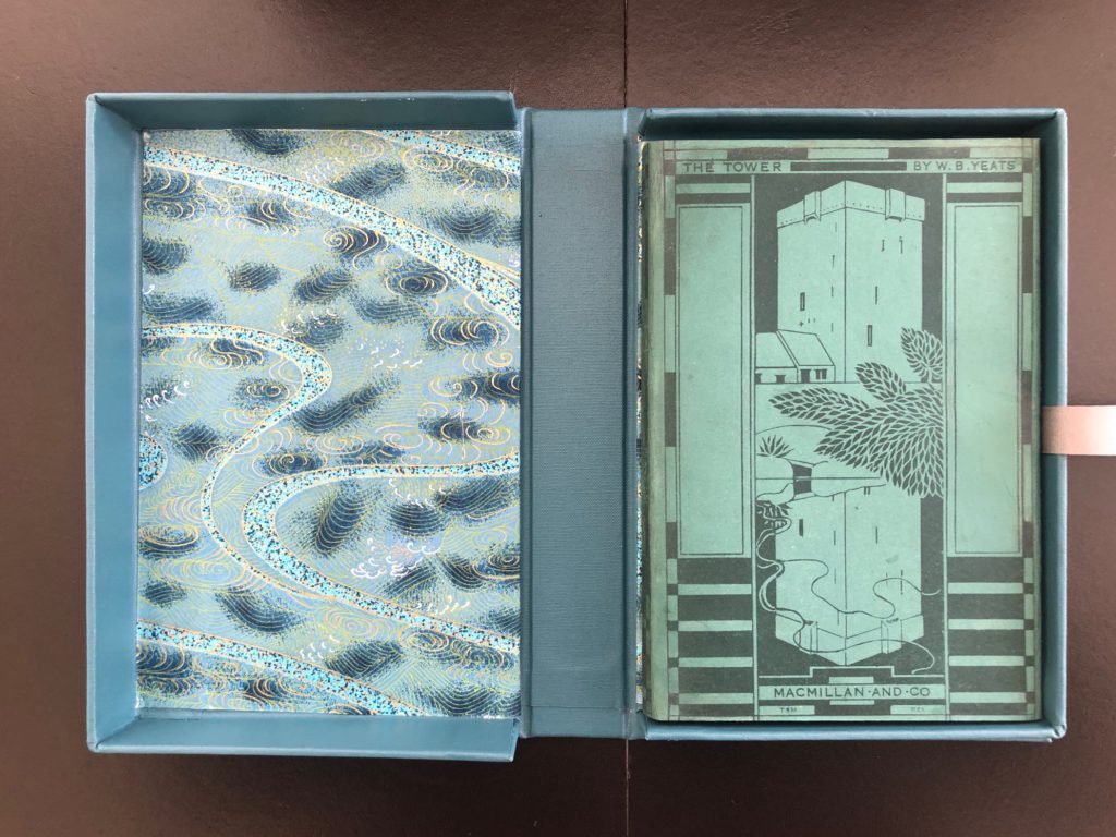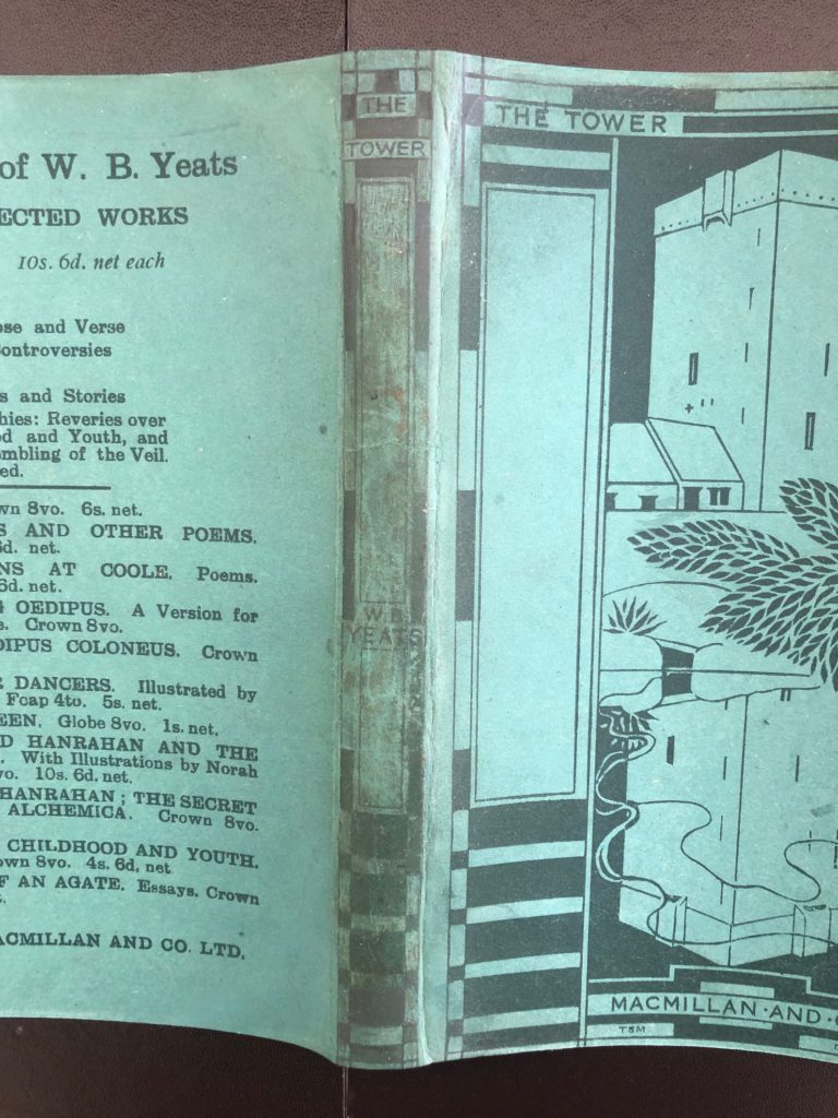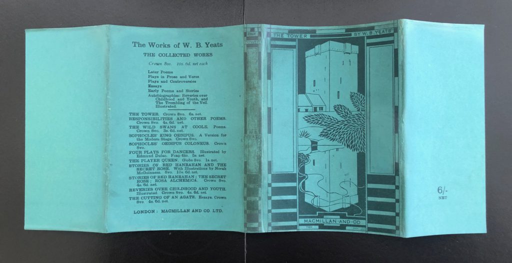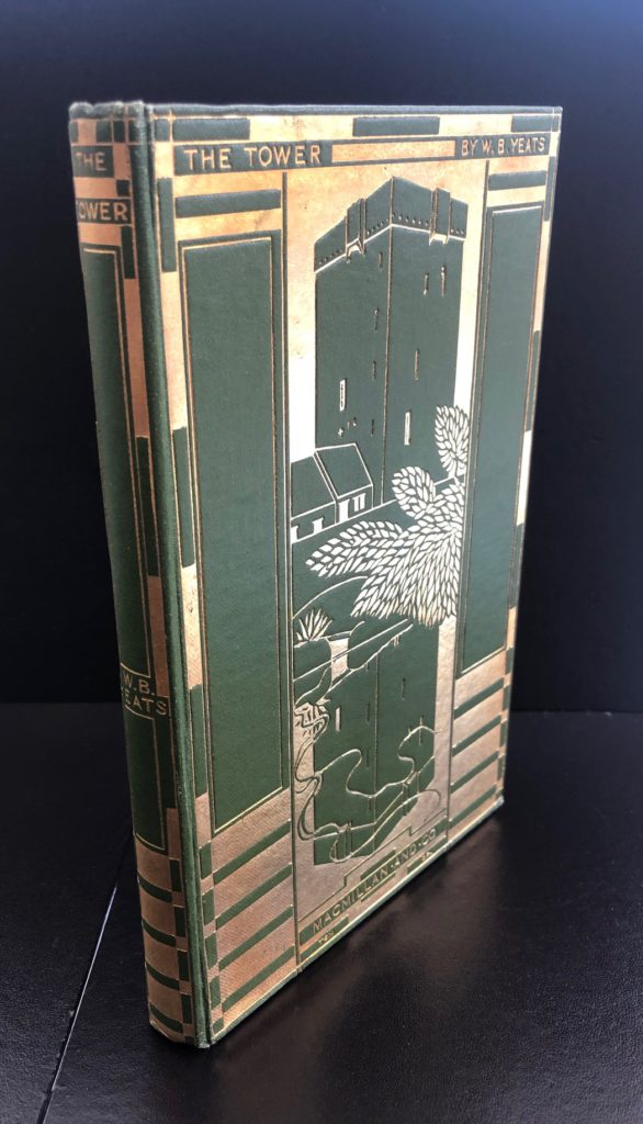 The First UK printing published by Macmillan & Co.Ltd., London in 1928. The BOOK is in near Fine condition. Original publisher's olive-green cloth, spine and upper cover lettered and elaborately decorated in gilt with one of Thomas Sturge Moore's most striking cover engravings, depicting Ballylee and its reflection. All edges are untrimmed. Free from inscriptions and internally very clean. Light pushing at the spine tips. The scarce WRAPPER is complete and is in near Fine condition. The sea-green pictorial wrapper is printed in black and repeats Sturge Moore's cover design. It is correctly priced '6/- net' to the lower front flap. A little toning and slight rubbing in places to the spine. The wrapper has undergone some expert professional restoration to the extreme spine tips and it now presents as a very striking example in the removable Brodart archival cover. One of only 2000 copies of this cornerstone of the Modern Movement, which is generally accepted to be Yeats's single most important collection. 'The Tower' includes many of Yeats's greatest and most enduring poems, including 'Sailing to Byzantium', 'Nineteen Hundred and Nineteen', 'Leda and the Swan', and 'Among School Children'. Connolly described it as 'a peak in English poetry' and the ODNB 'the summit of Yeats's creative achievement. He thought it the best book he had written, and he was right.' An extremely scarce, sharp copy with such attributes, housed in a custom solander box with gilt titling and marbled inserts.
